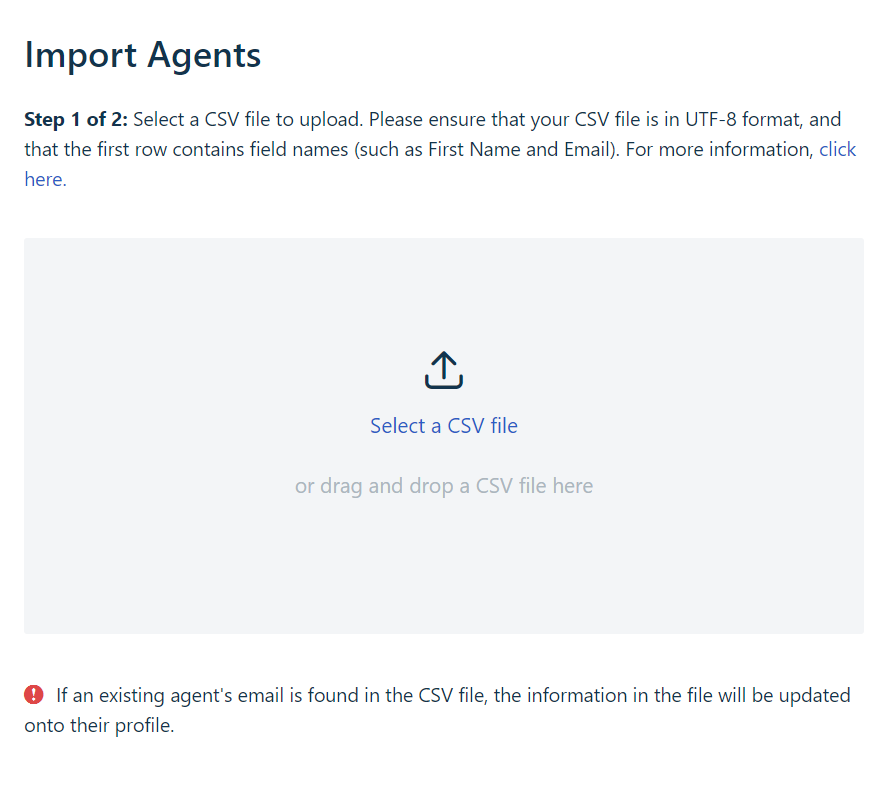 - O painel "Agentes de importação" aparecerá na tela. Selecione ou arraste e solte um arquivo CSV na área de upload de arquivo neste painel. Clique no botão "Carregar". (Formatos diferentes de CSV não são suportados. Para obter mais informações sobre o conteúdo do arquivo, consulte as seções abaixo)