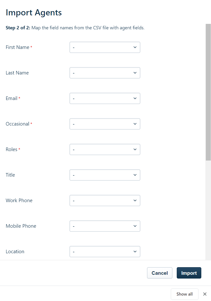 - Mapeie os atributos do agente para os cabeçalhos das colunas no arquivo CSV. Quando terminar, clique no botão " Importar ".