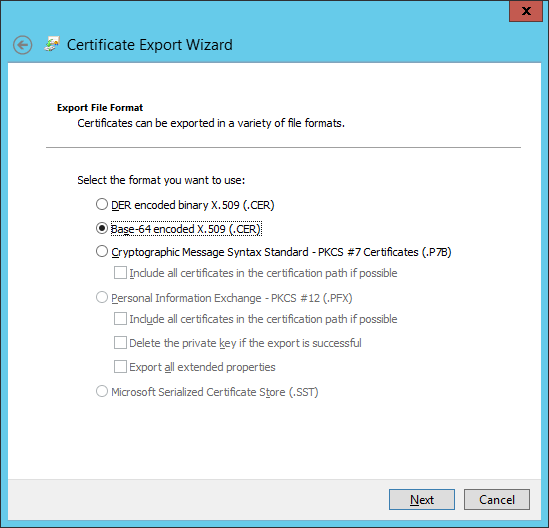 9. Um assistente de exportação de certificado aparecerá na tela. Selecione X.509 codificado em Base 64 (.CER) como opção. Feito isso, clique em Avançar.