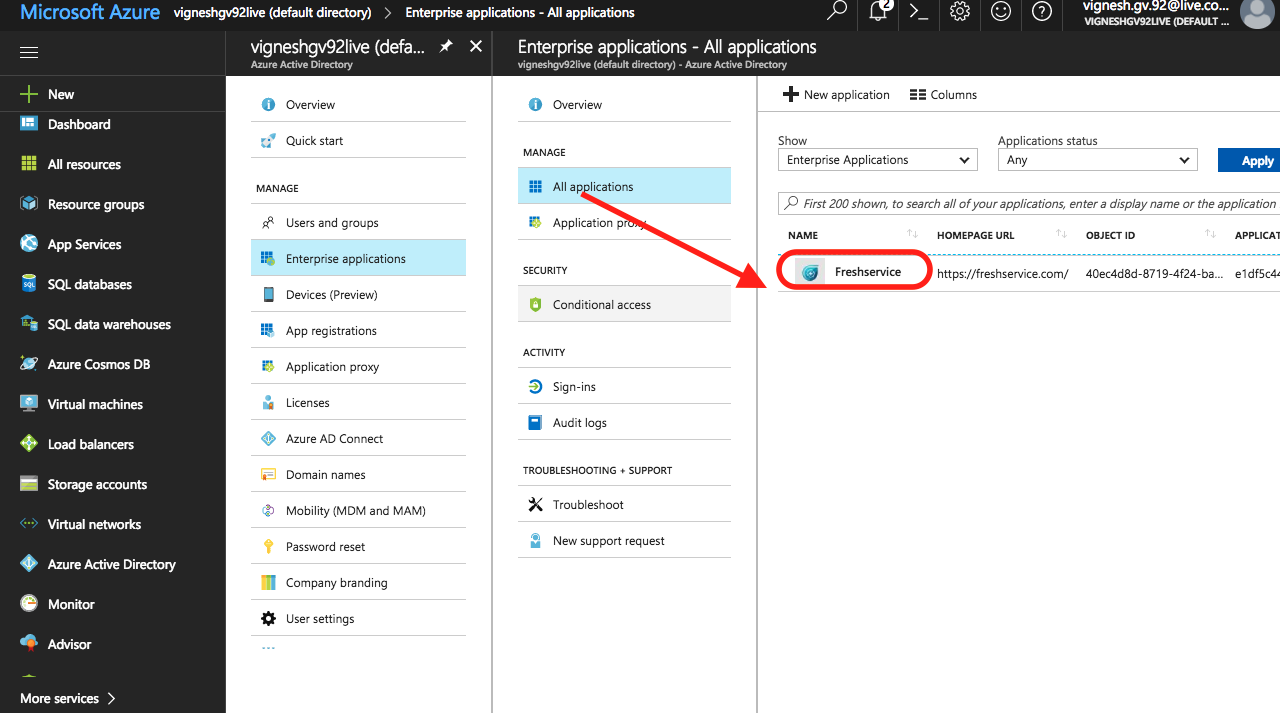 3. Depois que o aplicativo for adicionado ao portal do Azure, vá para Todos os aplicativos e clique em Freshservice .