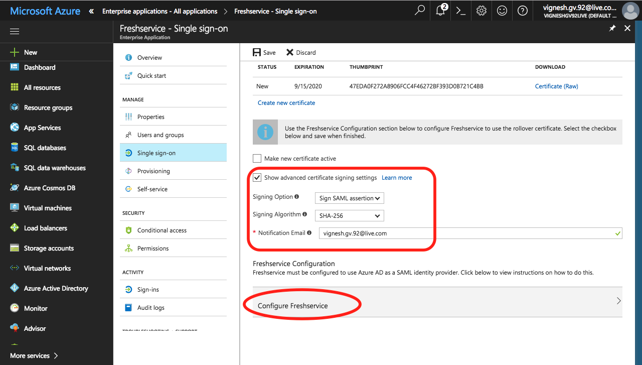6. Role para baixo até as configurações avançadas de assinatura de certificado e certifique-se de que o algoritmo de assinatura seja SHA-256. Feito isso, clique em Configurar Freshservice.