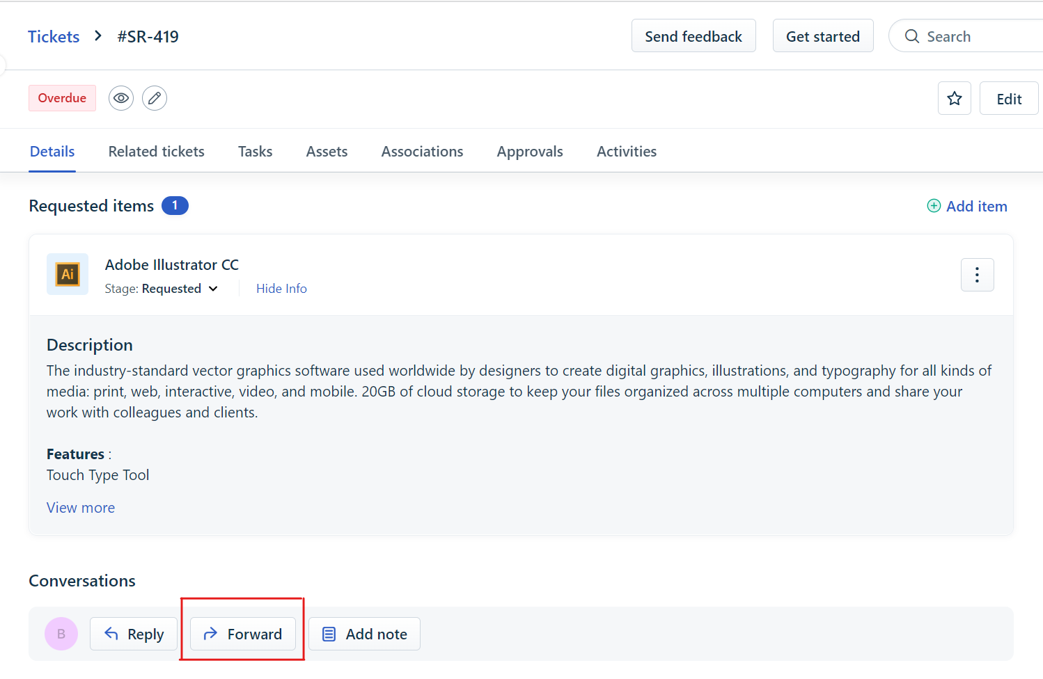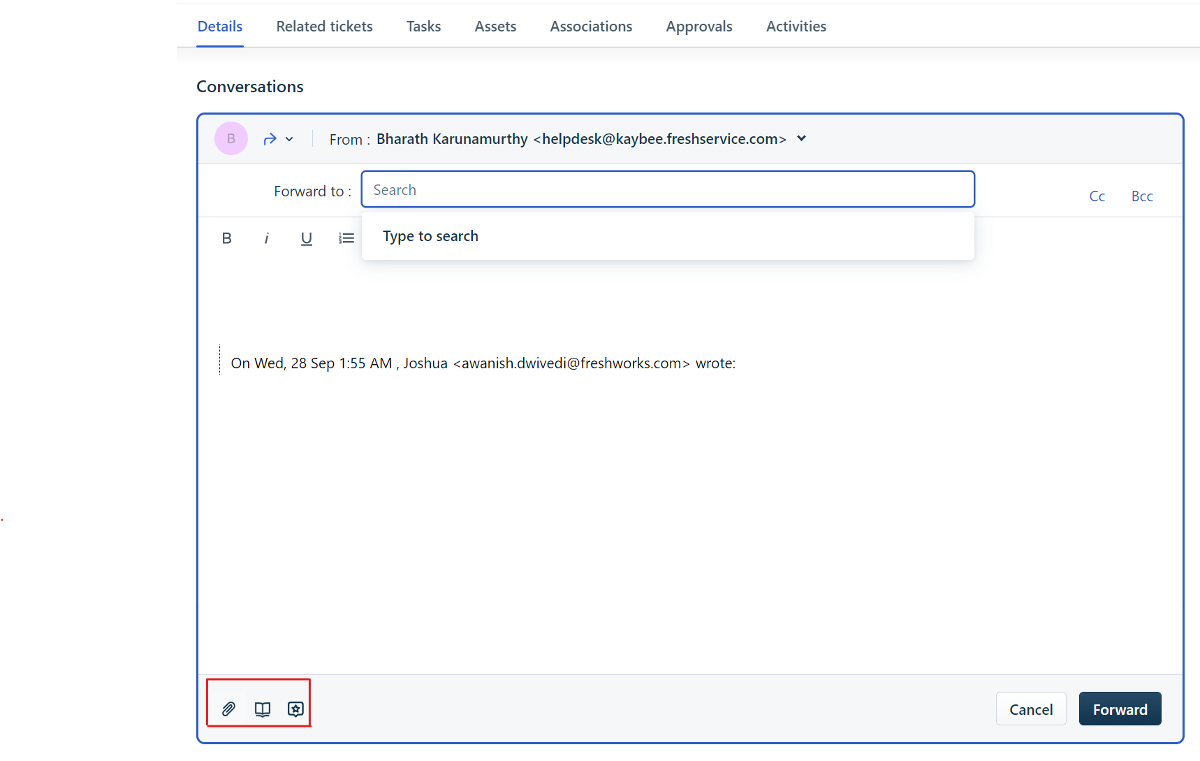 Às vezes, pode ser necessário envolver um fornecedor terceirizado ou alguém de fora de sua equipe em um ticket. O Freshservice permite que você encaminhe conversas para qualquer endereço de e-mail diretamente do ticket. Dessa forma, você pode facilmente ter qualquer um de seus fornecedores ou contatos de terceiros como parte da conversa.