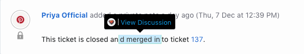Da mesma forma, qualquer agente que faça parte da conversa pode destacar o texto em um ticket. Se você deseja saber quem destacou uma área específica, passe o ponteiro do mouse sobre a seção destacada e poderá ver a foto do perfil. Você também pode clicar em Exibir discussão para ver a discussão associada à área destacada.
