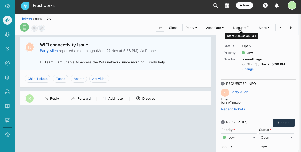 Com tantos incidentes e casos de uso chegando regularmente, é essencial que um agente de TI colabore com sua equipe para tomar decisões rápidas e eficientes. O recurso Discussão no Freshservice permite que você converse com seus colegas agentes, adicione vários agentes a uma conversa e até mesmo compartilhe arquivos relacionados a um ticket específico.