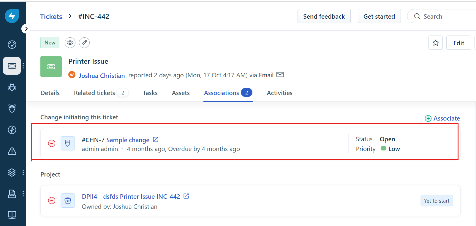 - Se você escolher Alterar ao iniciar este ticket , selecione entre as alterações existentes em seu service desk e clique em Associar . Você verá o ticket de alteração vinculado na guia Associações