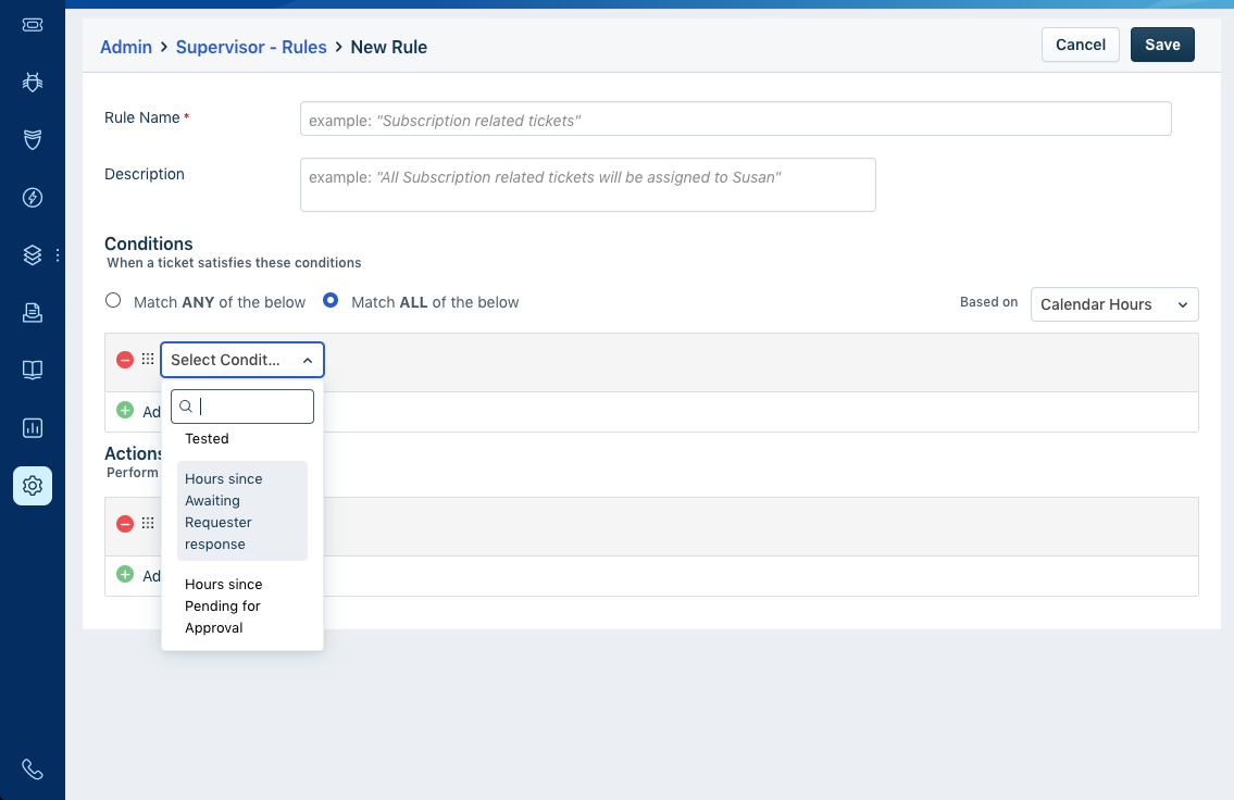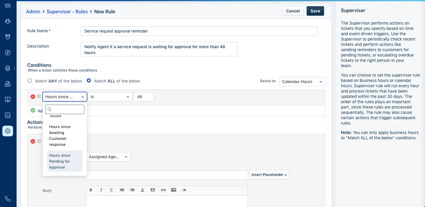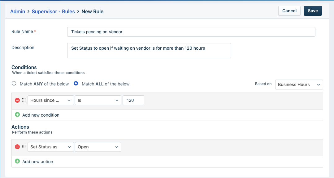 Se um agente marcou o ticket como, digamos, Pendente com o fornecedor, uma regra de supervisor pode ser configurada para lembrar o agente de verificar com o fornecedor ou mover o status do ticket após o horário especificado.