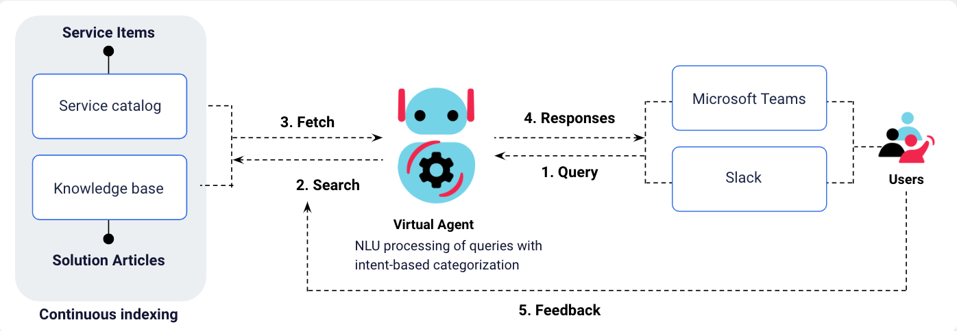 - O agente virtual procura correspondências na base de conhecimento e no catálogo de serviços. Todas as alterações no conteúdo são continuamente indexadas.