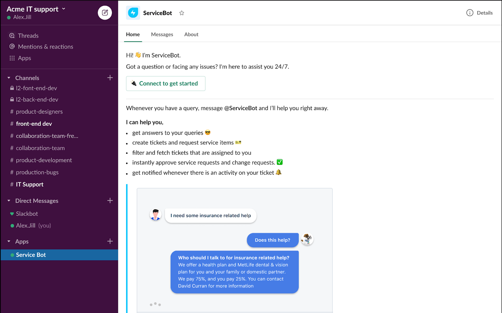 Use a barra de pesquisa global no Slack e procure por Servicebot