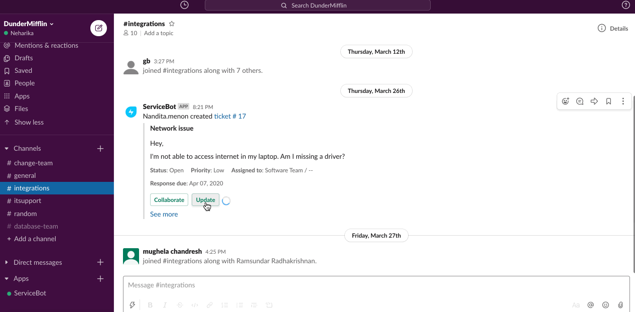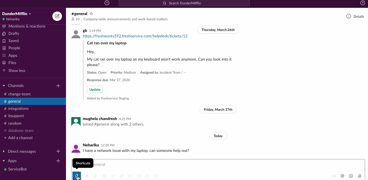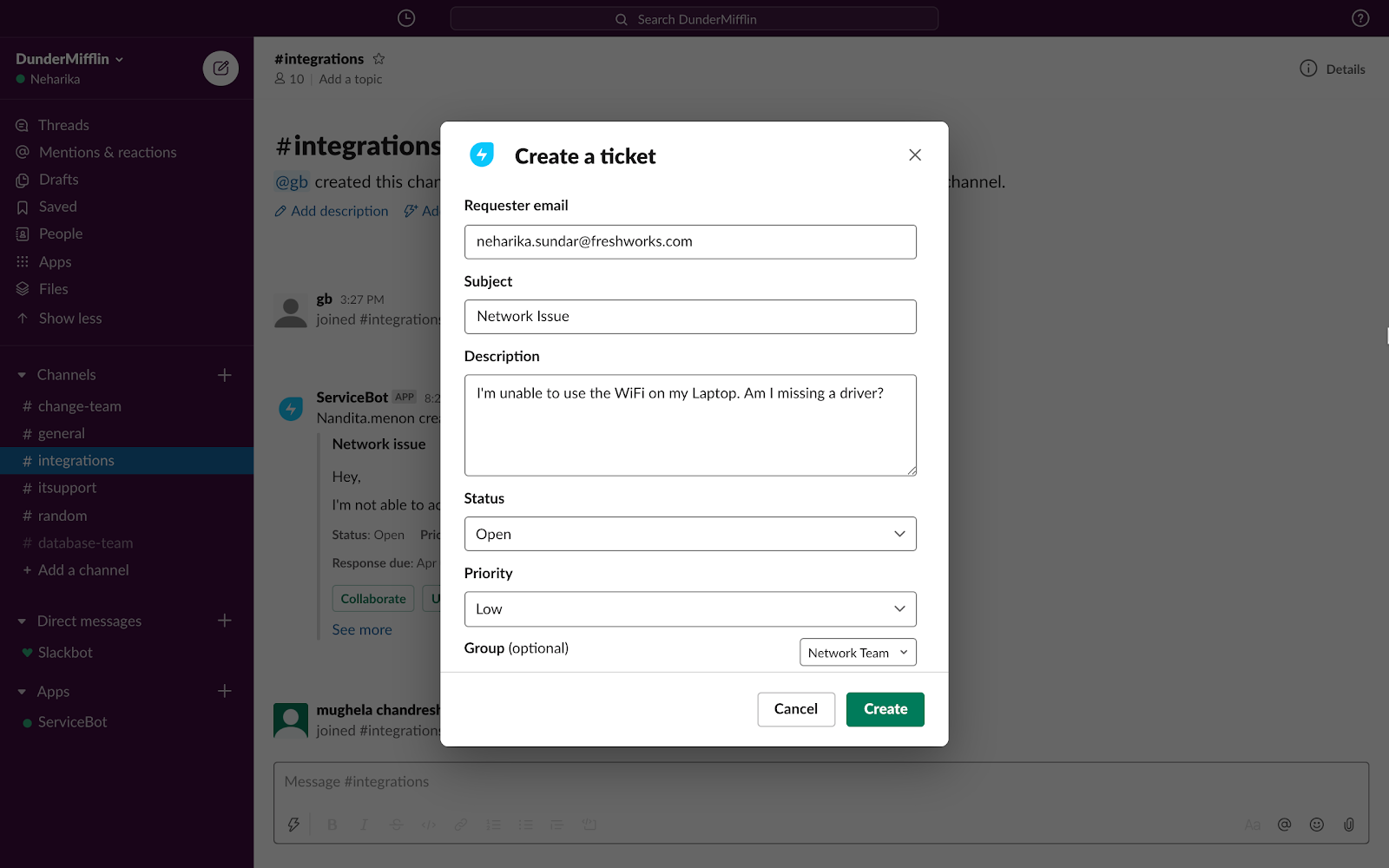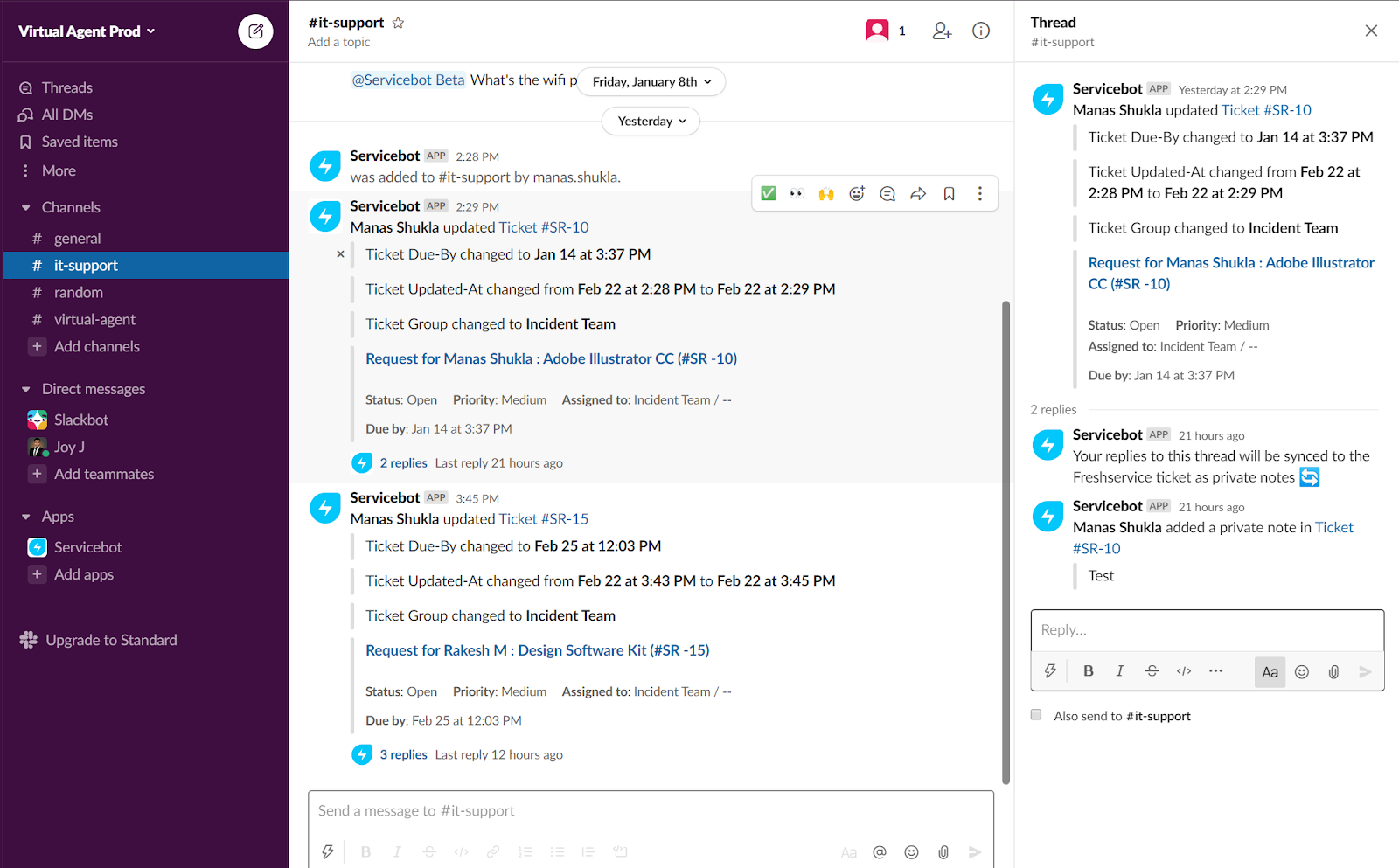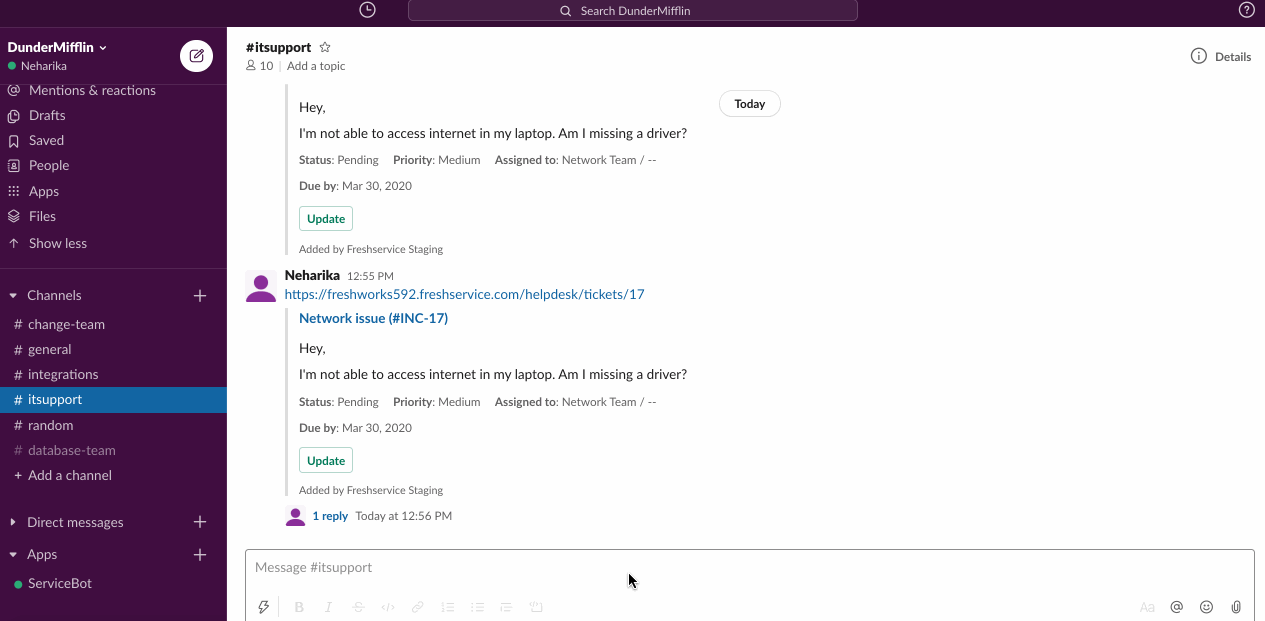 Cada tíquete é associado a um segmento separado na folga para facilitar o rastreamento. As notificações são adicionadas no tópico do canal respectivo como respostas quando as propriedades do ticket são atualizadas no Slack e no Freshservice