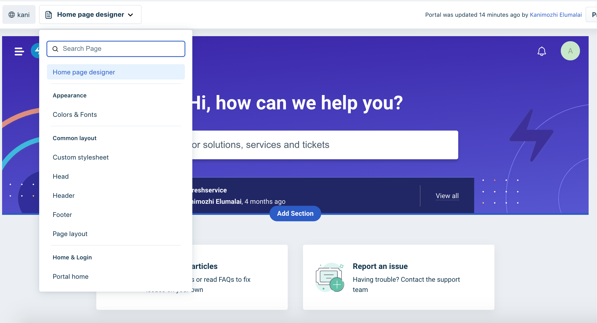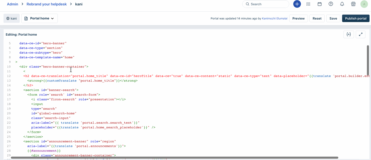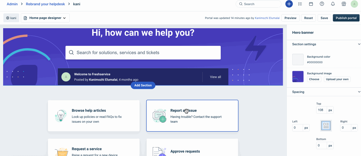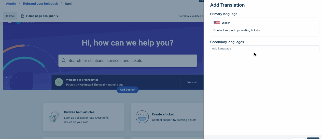 Com o criador de portais sem código do Freshservice, pule o gerenciamento de código volumoso para criar portais localizados acessíveis sem código. A interface gráfica do usuário é fácil de usar e permite criar portais personalizados rapidamente, sem a necessidade de conhecimento técnico prévio.