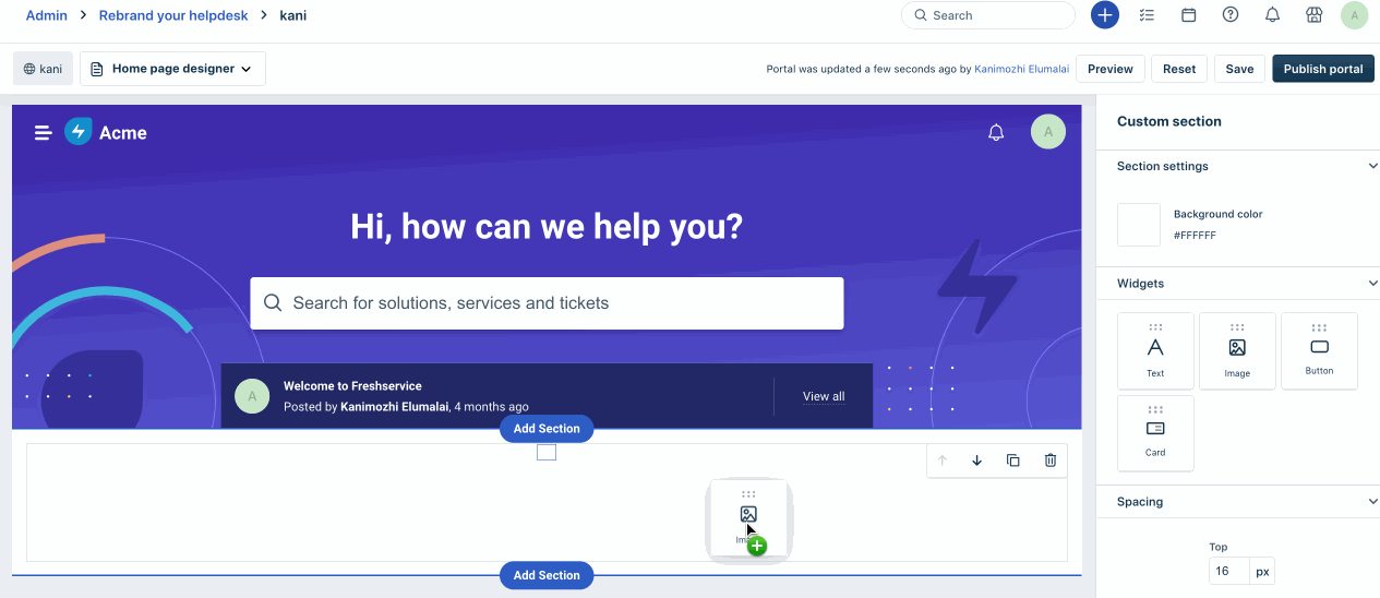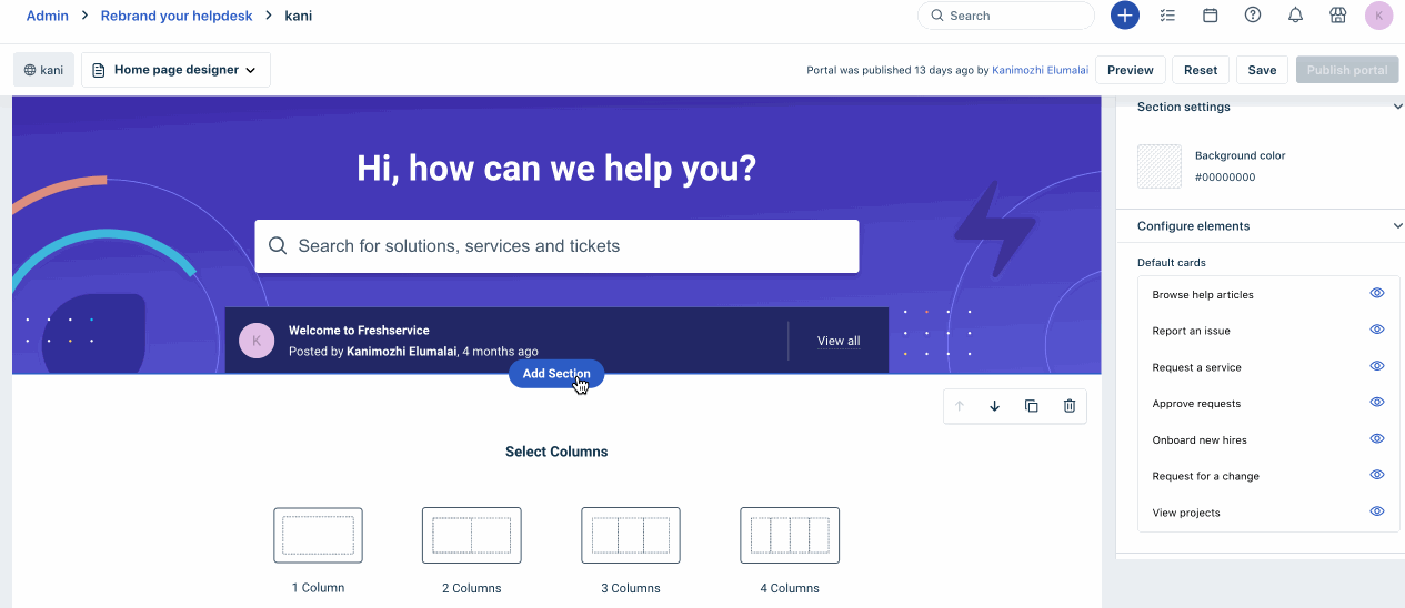 Adicione seções personalizadas com modelos de coluna variando de 1 a 4. Crie uma experiência de portal exclusiva personalizando cada coluna com uma combinação de widgets para adicionar - texto, imagens, botões e cartões.