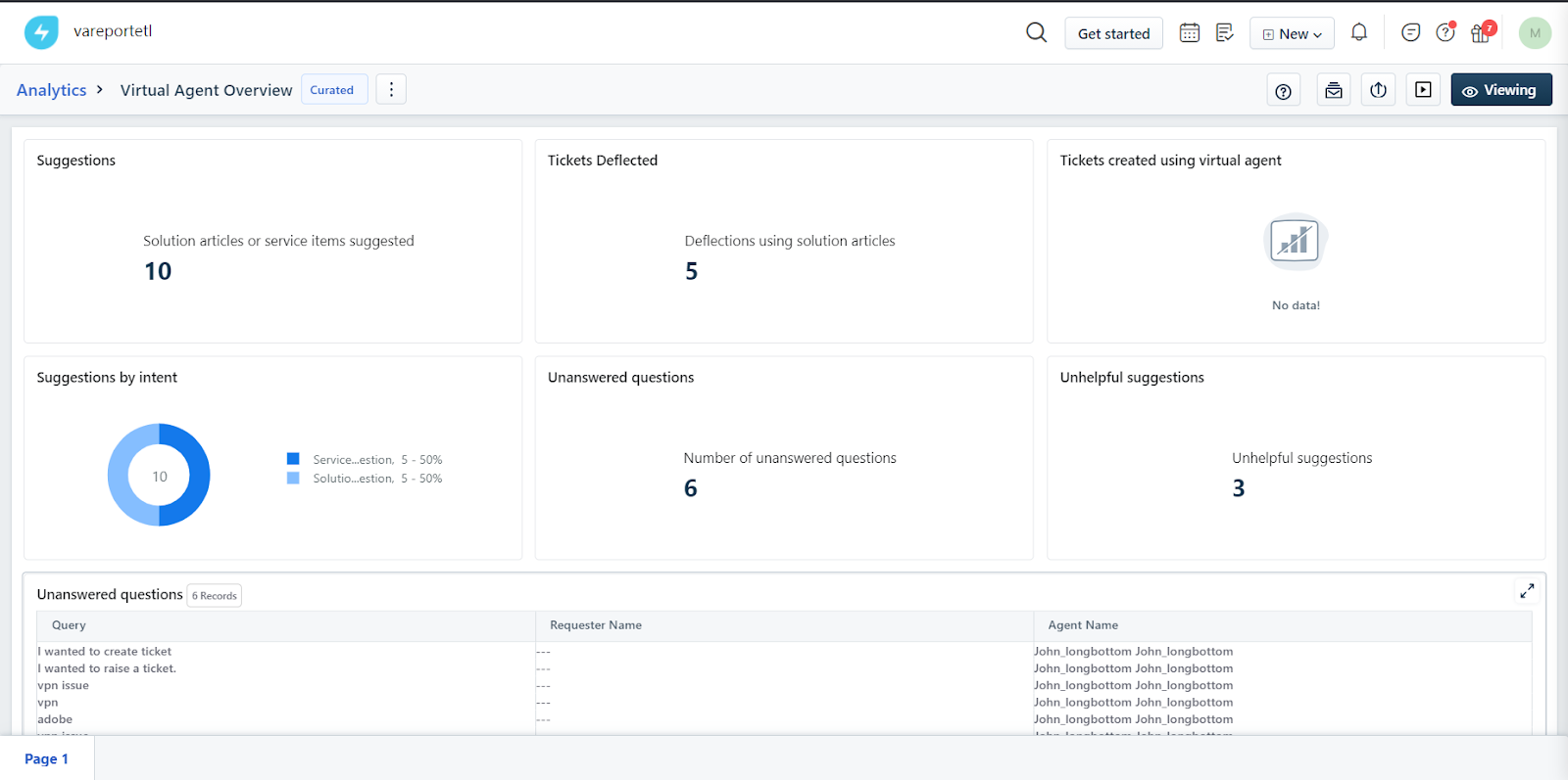 O Freshservice vem com um relatório 'pronto para uso' com curadoria que ajuda você a entender o desempenho do agente virtual.