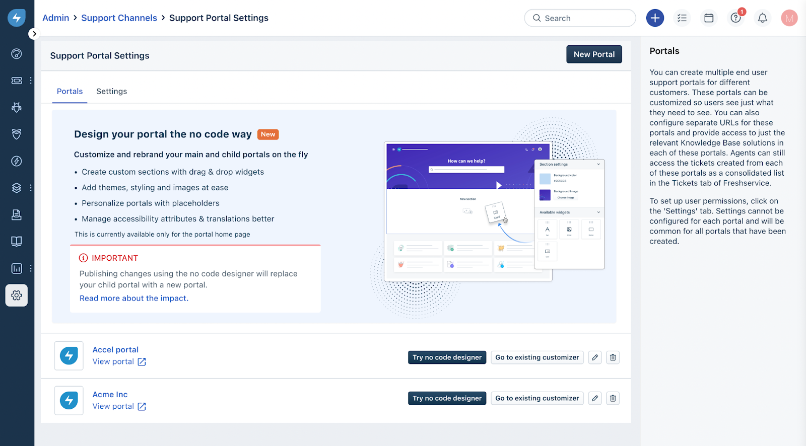 Para clientes MSP: A publicação de alterações em qualquer portal usando o designer sem código substituirá os portais pai e filho pelo Portal V2 . As personalizações serão afetadas de forma semelhante aos portais de service desk.
