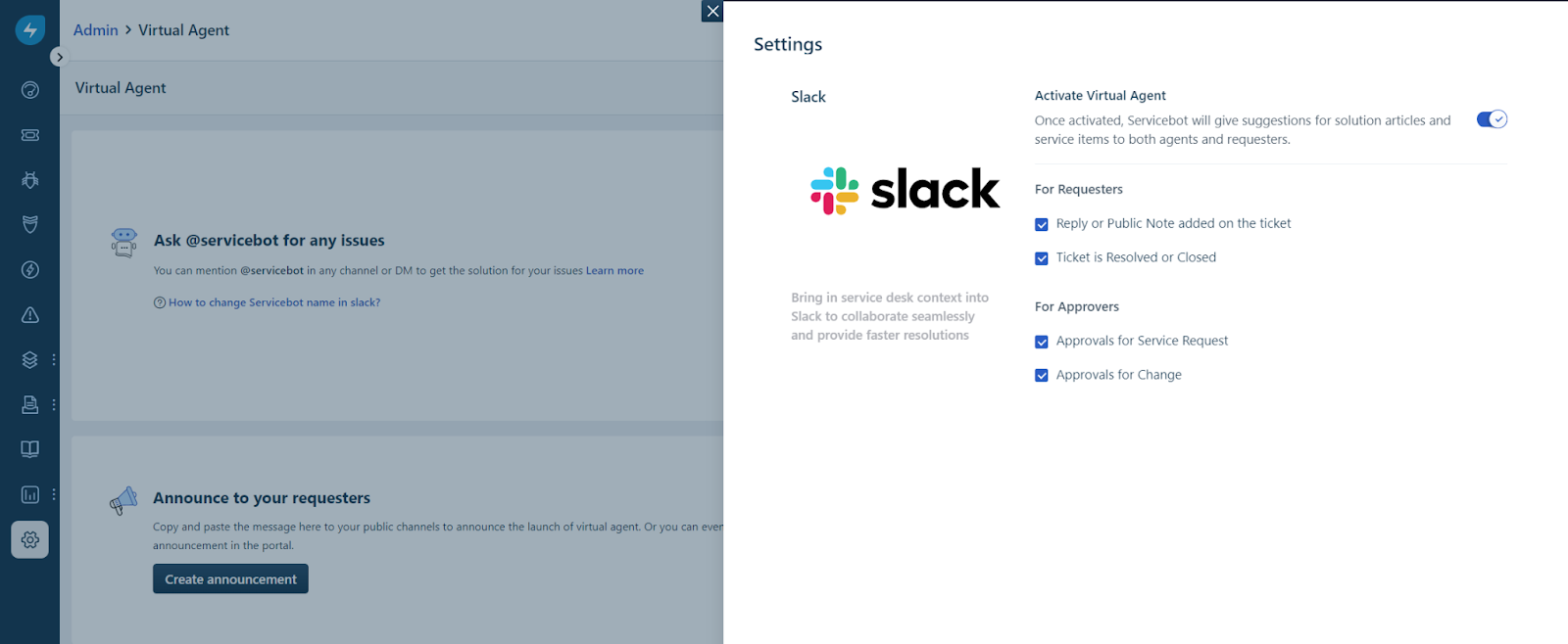 Verifique se o agente virtual está ativado nas configurações do slack acessando admin -> agente virtual -> Clique no ícone de engrenagem ao lado de Slack