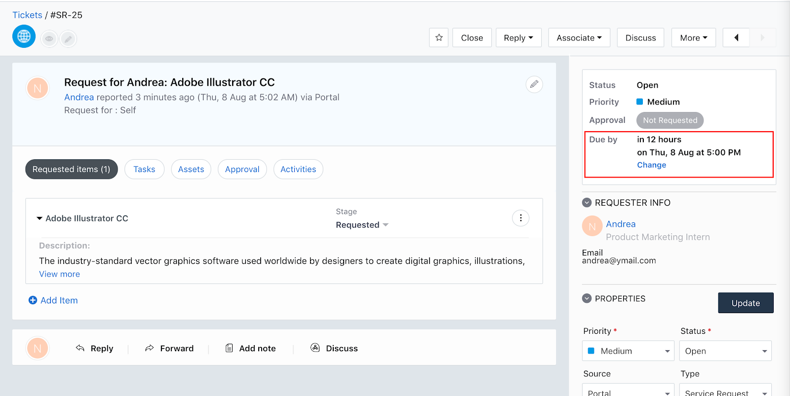 Suas Políticas de SLA serão usadas no Freshservice para determinar a data e hora da “primeira resposta vencida” e da “resolução vencida” para cada tíquete recebido. Você pode ter uma política de SLA padrão para todos os clientes ou várias políticas de SLA para diferentes níveis de clientes, como aqueles que assinaram seu pacote de Suporte Premium. Você pode encontrar o vencimento por hora para cada ticket à direita do ticket.