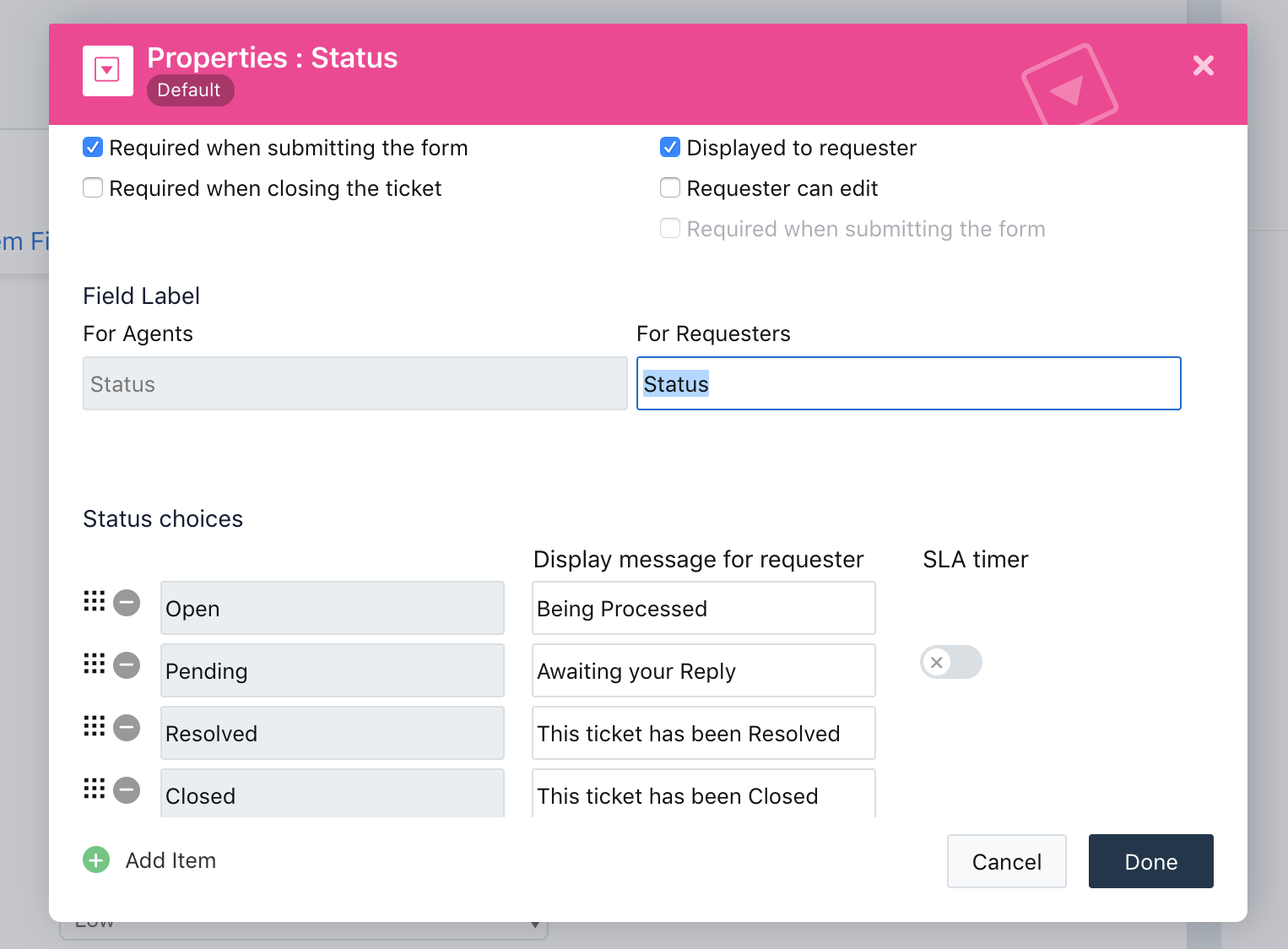 Sob a propriedade Status , as opções de status , como mensagens de exibição personalizadas para os solicitantes, podem ser editadas. A alternância do cronômetro SLA pode ser usada para definir se os cronômetros SLA devem ser executados para o status específico do ticket. Use o botão Adicionar item para incluir mais status. Clique aqui para saber mais sobre status de tickets e timers de SLA