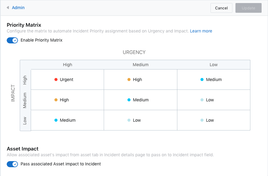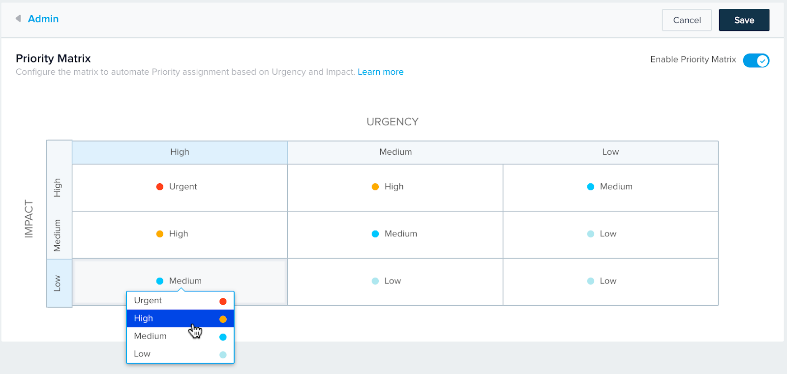 - O administrador pode editar e escolher uma Prioridade no menu suspenso para cada par de níveis em Impacto e Urgência.