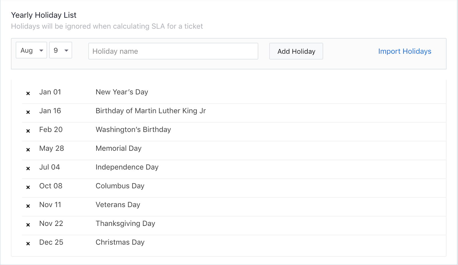 Você pode definir a Lista Anual de Feriados manualmente ou importando a lista de feriados de um país. Os feriados serão ignorados ao calcular os SLAs de um ticket.