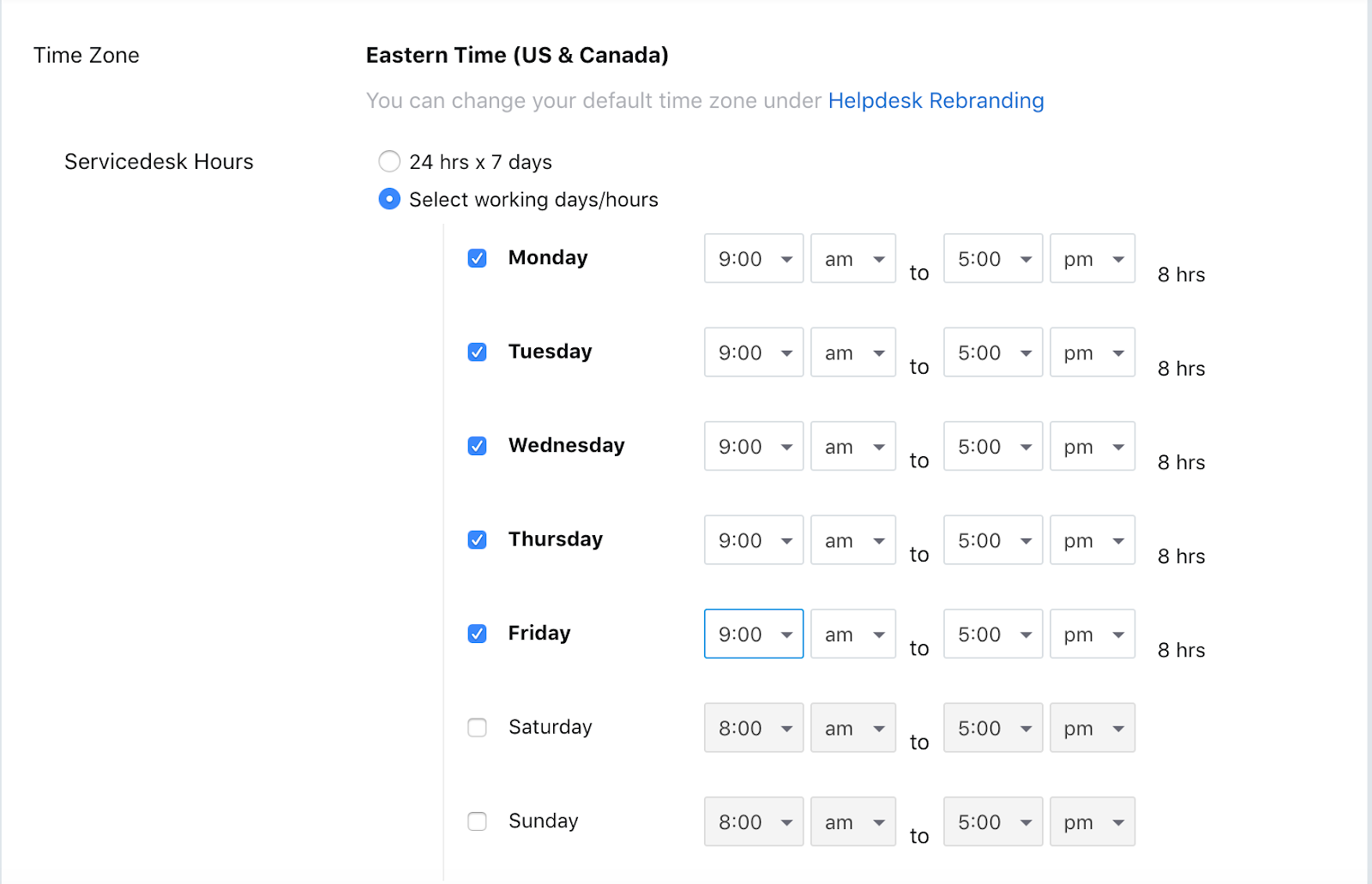 Vá para Admin > Gerenciamento de serviços > Configurações de suporte técnico > Horário comercial