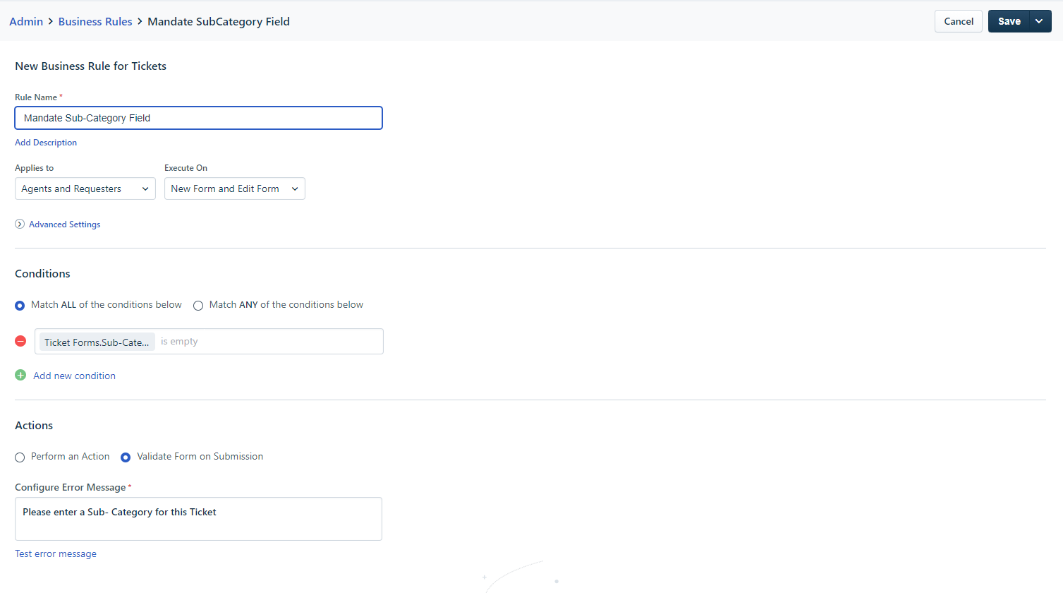 Existem casos de uso específicos que exigem que você determine Subcategoria, permitindo que o campo Item permaneça vazio. A ação Mandate não suporta a obrigatoriedade de um nível específico, no entanto, isso pode ser feito configurando uma regra de validação simples usando o operador “Is Empty”. Aqui está um exemplo abaixo:-