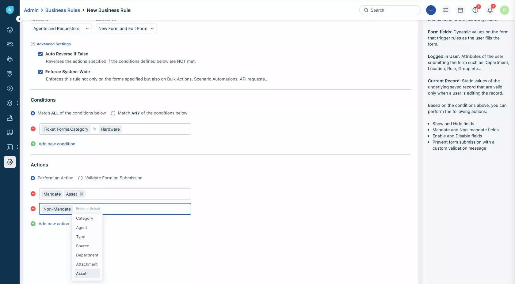 Associações de ativos obrigatórios e não obrigatórios condicionalmente para tickets com base em categorias, status, etc.