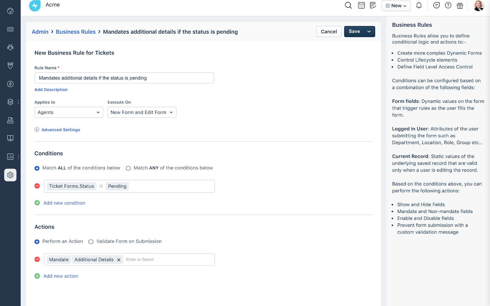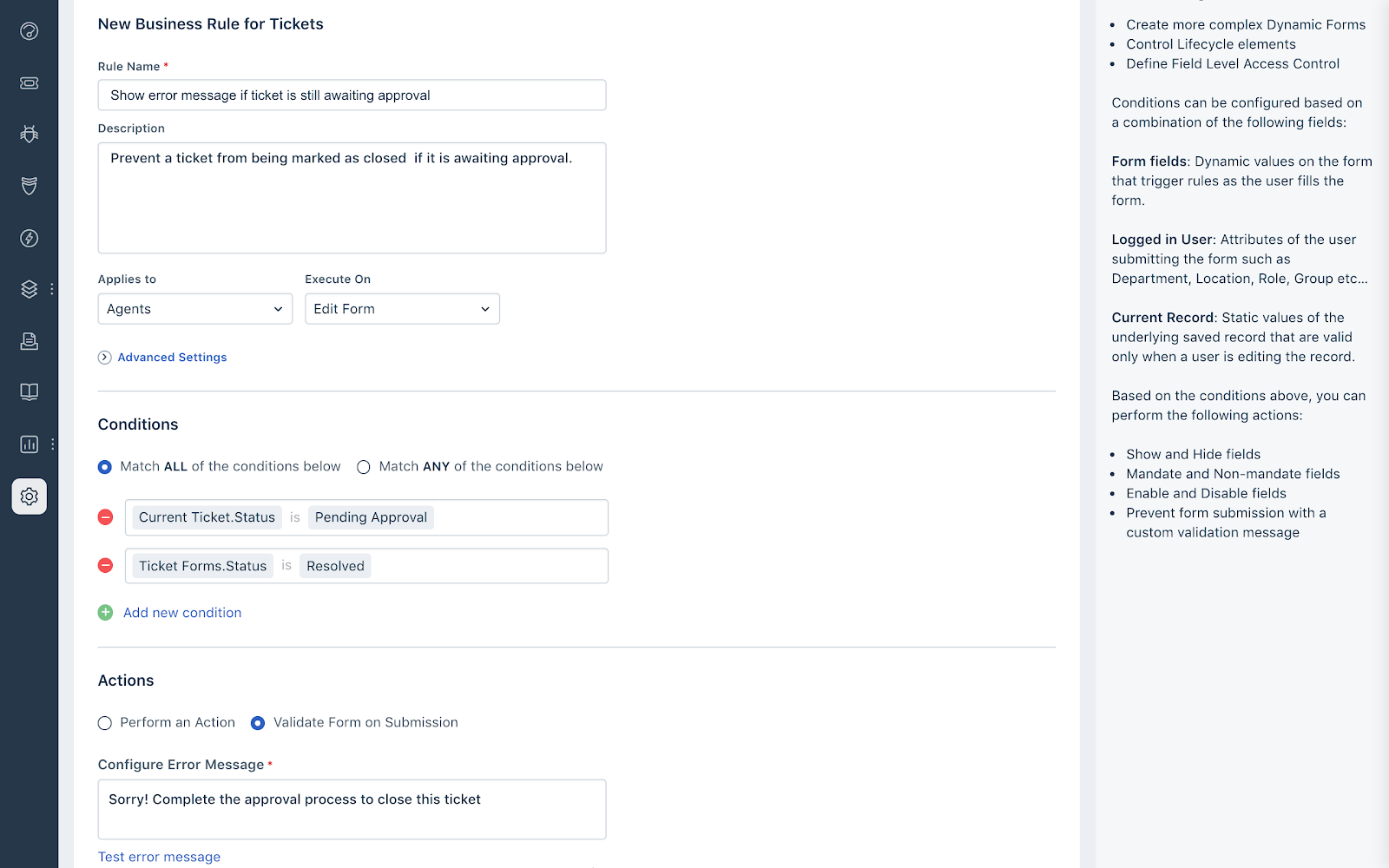 Aqui, o status do ticket atual captura em qual status o ticket está atualmente e o status do formulário do ticket captura para o qual o agente está tentando mover o status.Impedir atualizações nas propriedades do tíquete para tíquetes fechados: outro caso de uso do ciclo de vida do tíquete, em que as atualizações nas propriedades do tíquete não devem ocorrer depois que o tíquete é fechado.