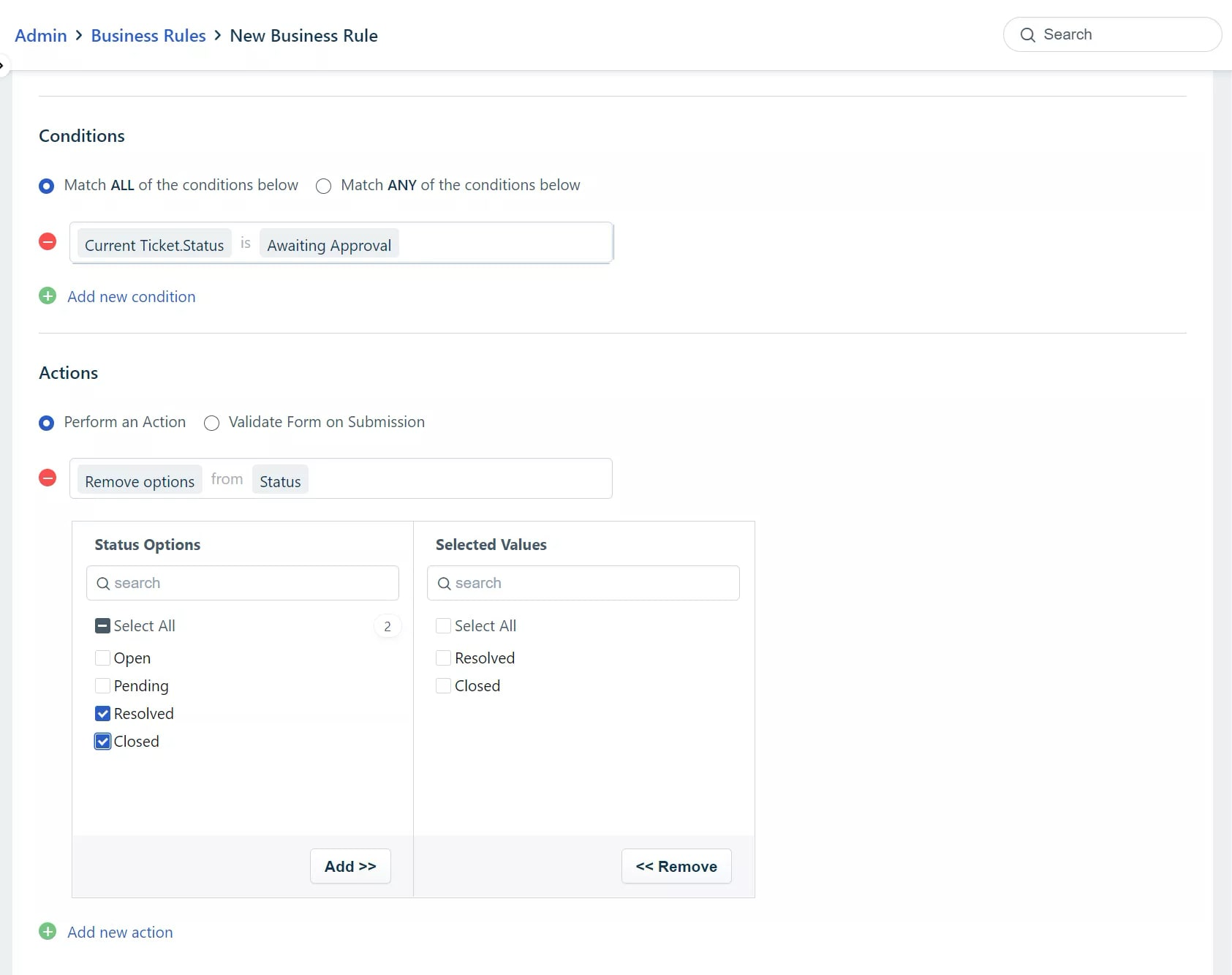 Remover opções- Removendo os status Resolvido e Fechado do menu suspenso de status de um ticket que está aguardando aprovação usando a opção Remover.