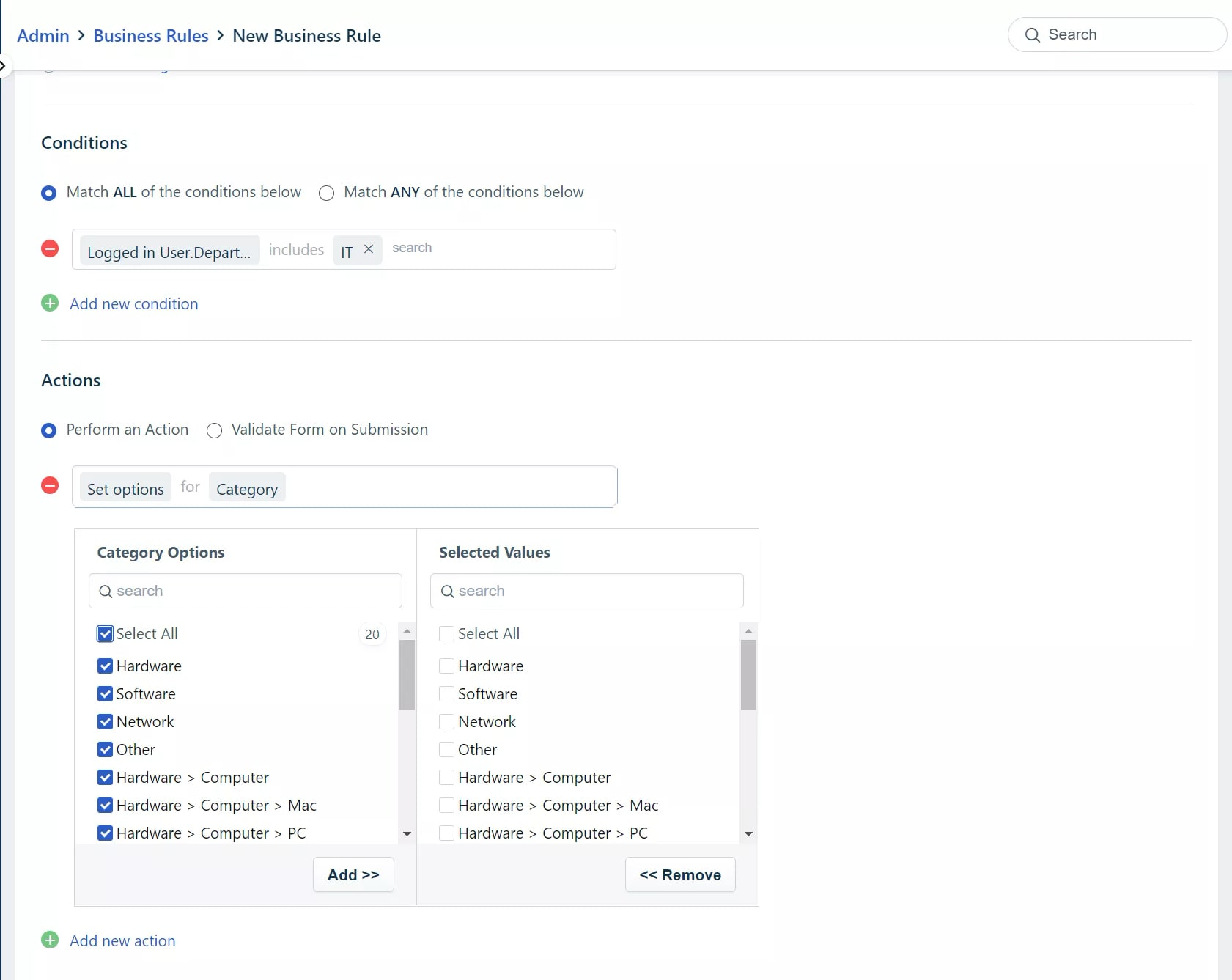 Para um conjunto específico de local, departamento e grupo do solicitante, você pode restringir as categorias a serem exibidas no formulário.