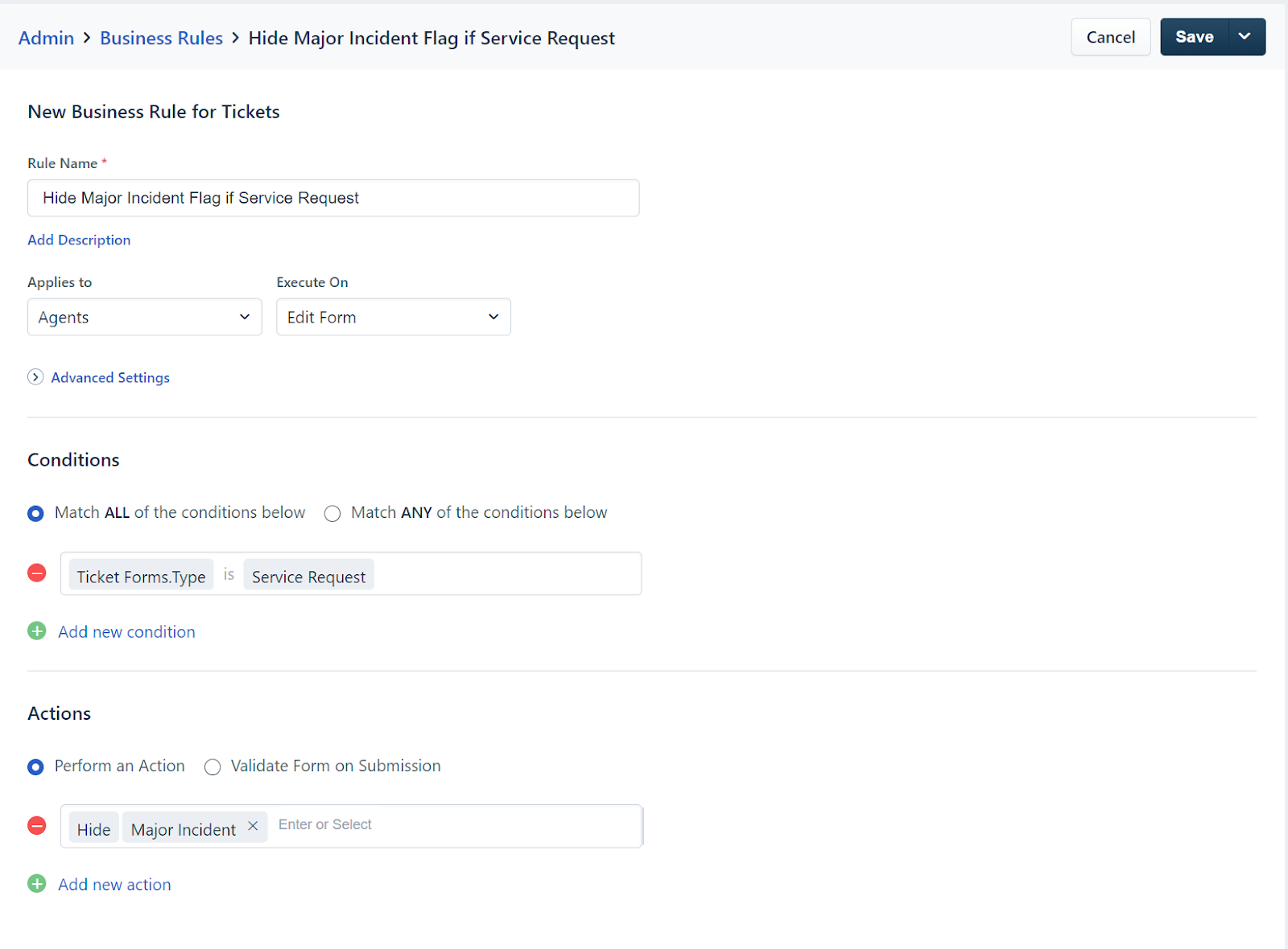 Mostrar/ocultar campos com base no tipo de ticket Frequentemente, você terá campos específicos exibidos para incidentes e outro conjunto de campos para solicitações de serviço. O campo Ticket Type só está disponível quando você está editando um Ticket, portanto, este campo só aparece quando você criou uma regra específica para o Edit Form . Aqui está um exemplo de como configurar isso: -