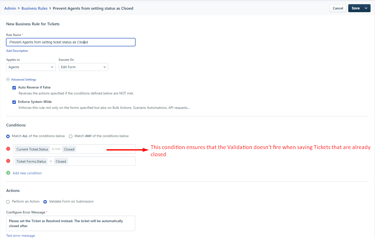 Se você quiser evitar que os agentes fechem tíquetes diretamente, pois um tíquete precisa ser resolvido primeiro antes de ser fechado automaticamente após um período de tempo específico usando uma regra do supervisor, você pode configurar a regra abaixo.