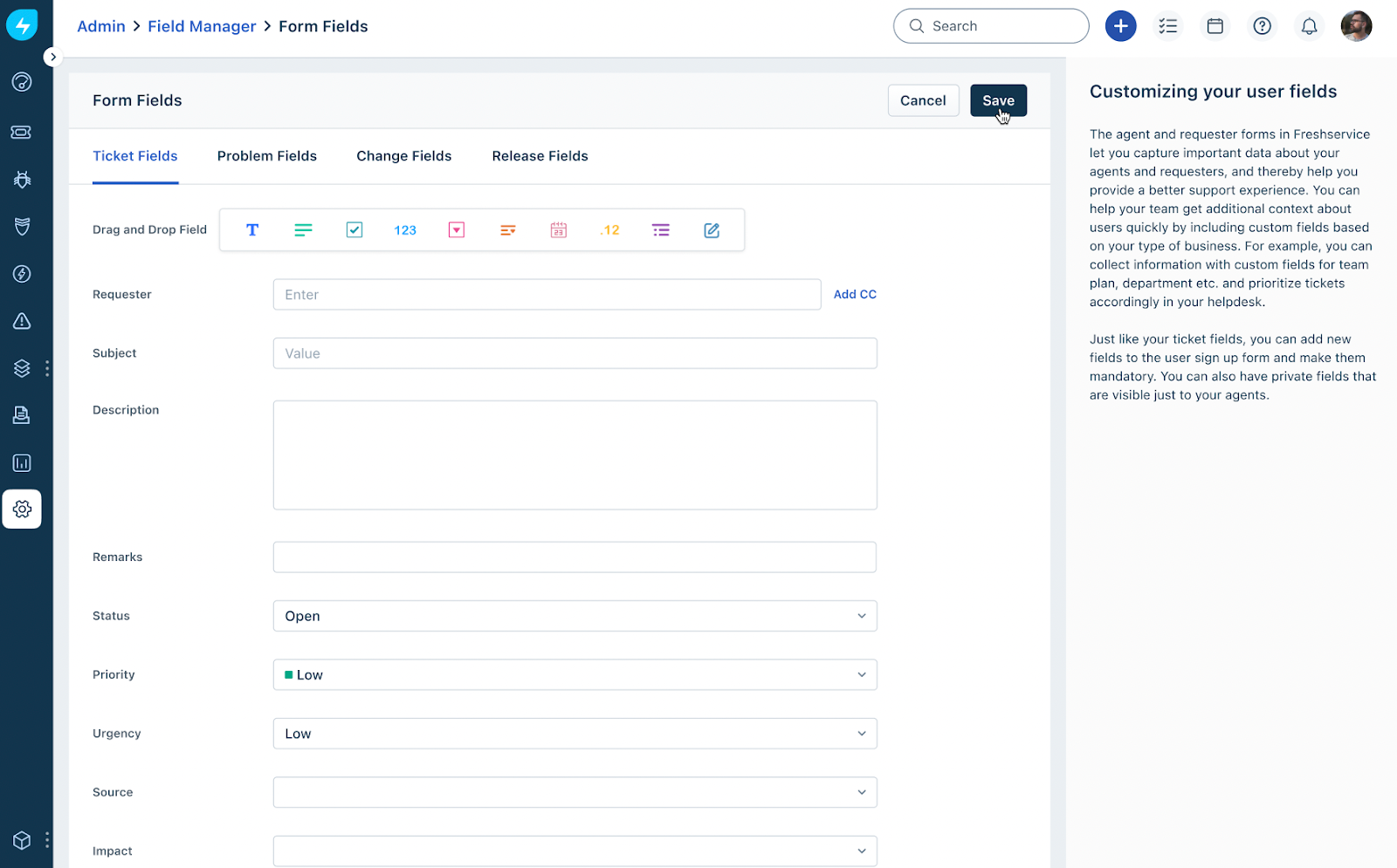 No entanto, excluir um campo de ticket é uma ação irreversível e você não poderá recuperá-los. Recomendamos que você use a opção de arquivo se não tiver certeza se o campo será necessário posteriormente.