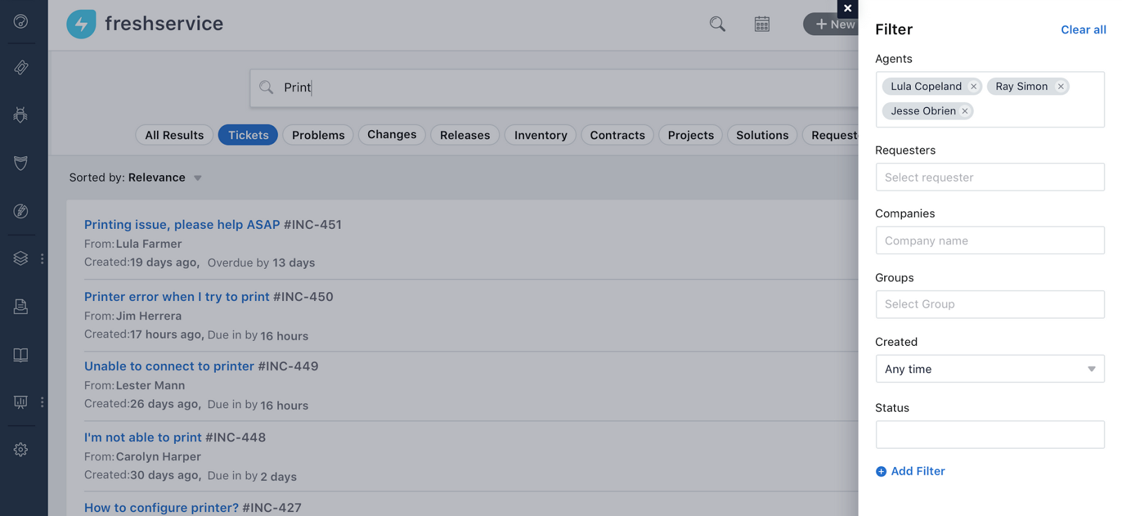 Quando você insere várias palavras-chave, o Freshservice lista vários resultados com base nas seguintes condições: