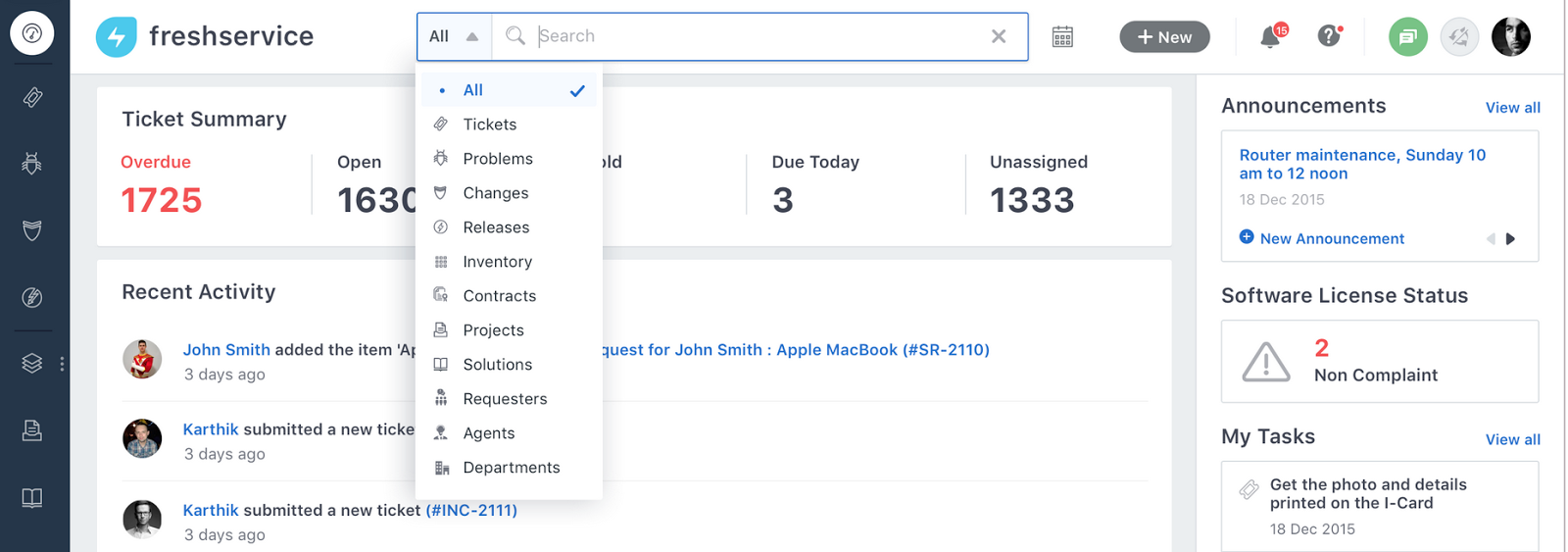 A barra de pesquisa universal no Freshservice permite que você pesquise nos módulos e obtenha resultados instantâneos. Sempre que você digitar uma palavra-chave na barra de pesquisa, obterá resultados dos seguintes módulos:
