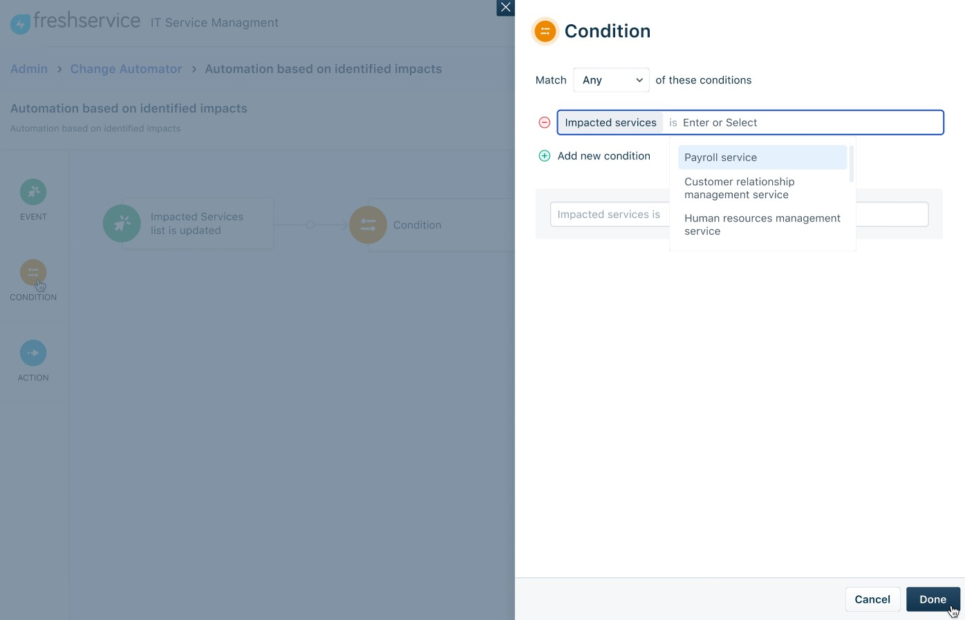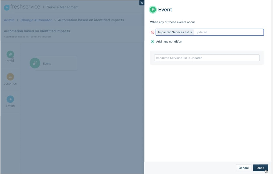 Um fluxo de trabalho automatizado será criado. Isso acionará automaticamente a ação sempre que ocorrer a condição definida para os serviços afetados, economizando muito tempo e esforço do agente e minimizando o risco associado à alteração.