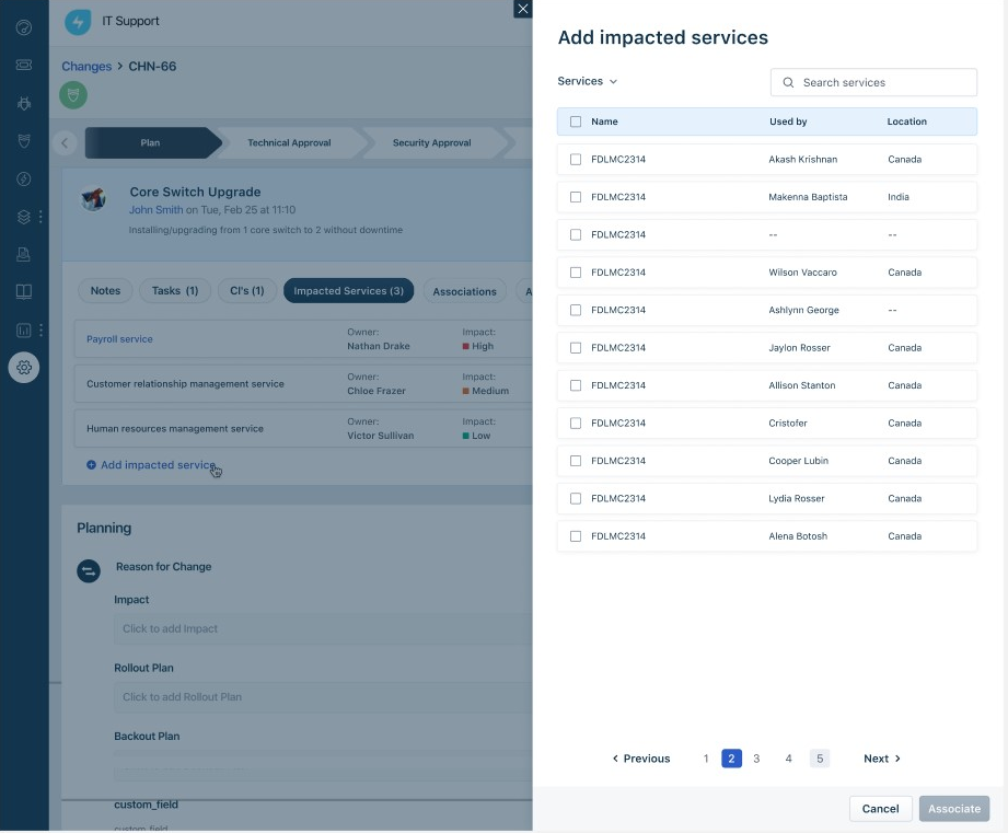 Com o Freshservice, os gerentes e implementadores de mudança agora podem associar proativamente 'Serviços impactados de uma mudança' e automatizar aprovações com base no 'impacto'. Se os gerentes de mudança souberem antecipadamente sobre os serviços que podem ser afetados pela mudança e quantos usuários podem ser afetados, eles podem criar estratégias de acordo. Isso acabará por reduzir o número de interrupções não planejadas em serviços essenciais aos negócios. Também ajuda o aprovador a tomar decisões informadas sobre a aprovação/rejeição de quaisquer planos de mudança.