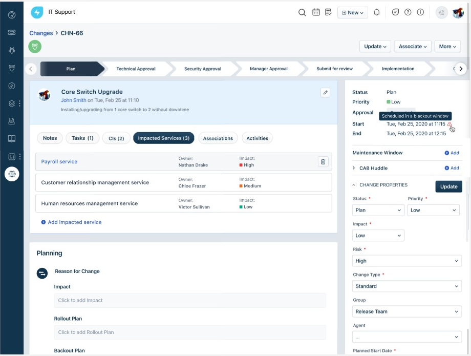 O gerenciamento de mudanças é uma parte extremamente crítica do funcionamento dos negócios de qualquer organização e precisa ser realizado com o mínimo de impacto. Para reduzir as surpresas pós-implementação e, portanto, reduzir o número de interrupções não planejadas nos serviços críticos de negócios, é importante que a equipe seja capaz de avaliar o impacto de qualquer mudança.