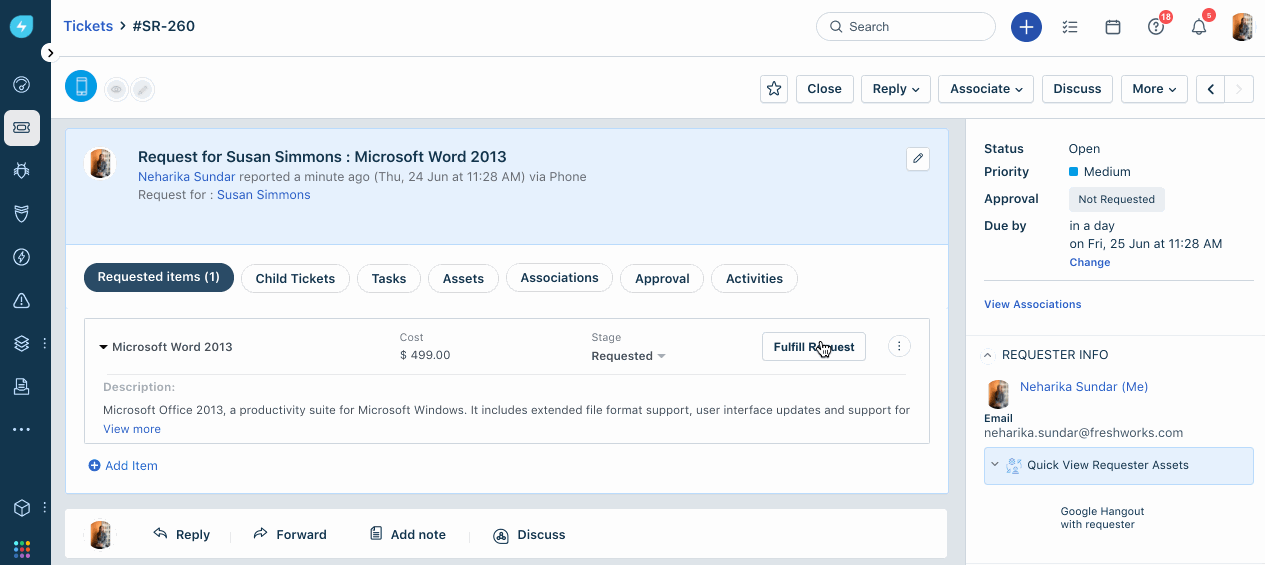 Com o Service Request Fulfillment , os agentes agora podem pesquisar rapidamente um item em estoque e alocá-lo ao usuário na página do ticket. Reduzindo assim a carga de trabalho envolvida na solicitação e recebimento de acesso a esses serviços.