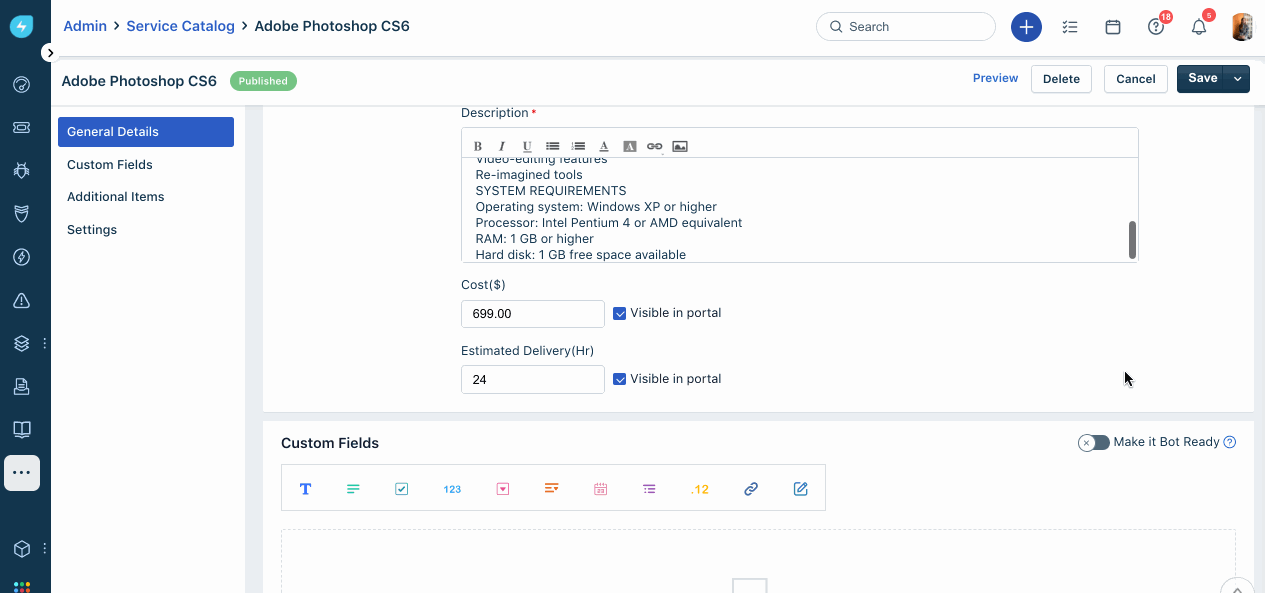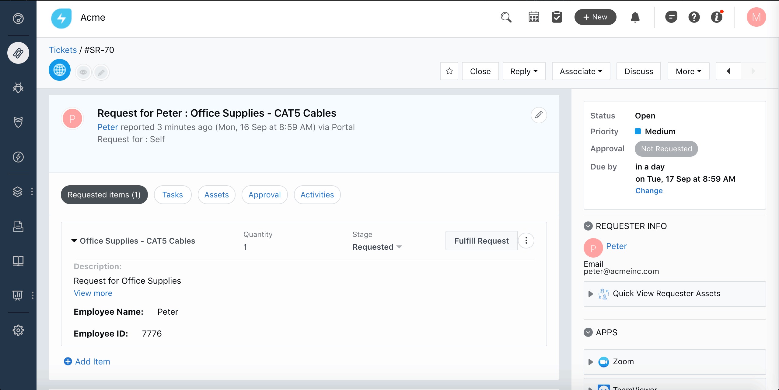 Pré-requisito: Ao criar um item de serviço em Admin -> Catálogo de serviços -> Item de serviço, em Itens adicionais > Configurações de serviço, certifique-se de que gosta do tipo de ativo, produto ou software para o item de serviço. Se você perder, a opção “Atender solicitação” não estará disponível na página de solicitação de serviço.