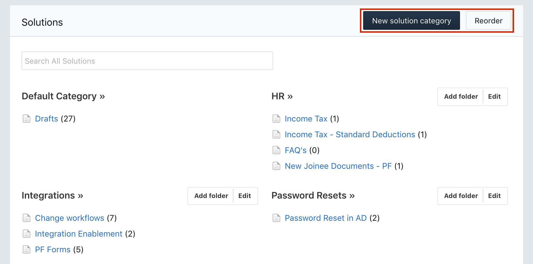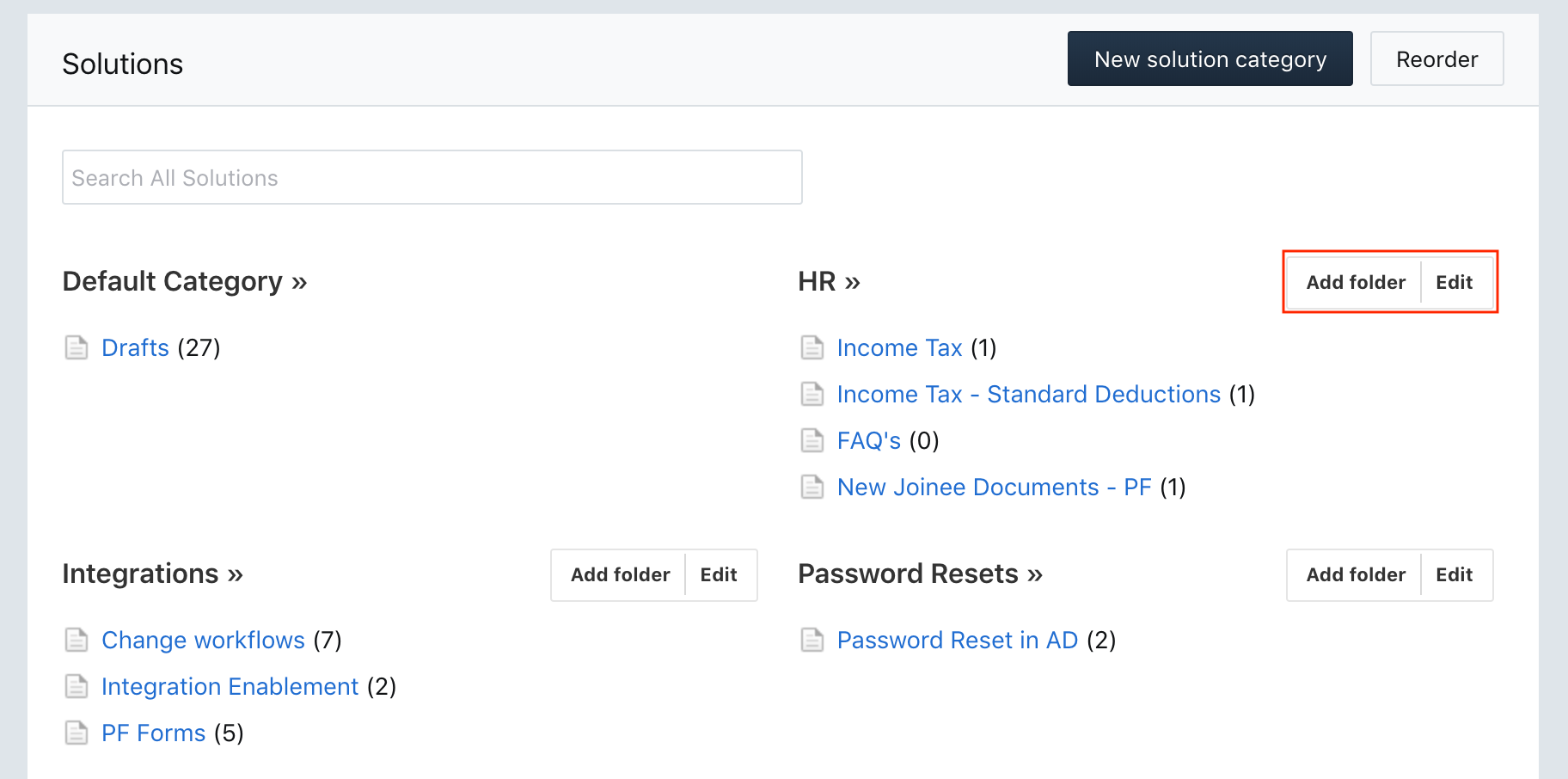Uma coleção de artigos de soluções relacionados é organizada em pastas. As pastas tornam conveniente para os usuários ler artigos semelhantes e outras soluções relevantes para seus problemas. Eles também podem fornecer uma maneira rápida de descobrir tudo o que você pode saber sobre uma seção específica em sua base de conhecimento. Por exemplo, você agruparia soluções relacionadas a credenciais de login e artigos relacionados a permissões na pasta "Privilégios".