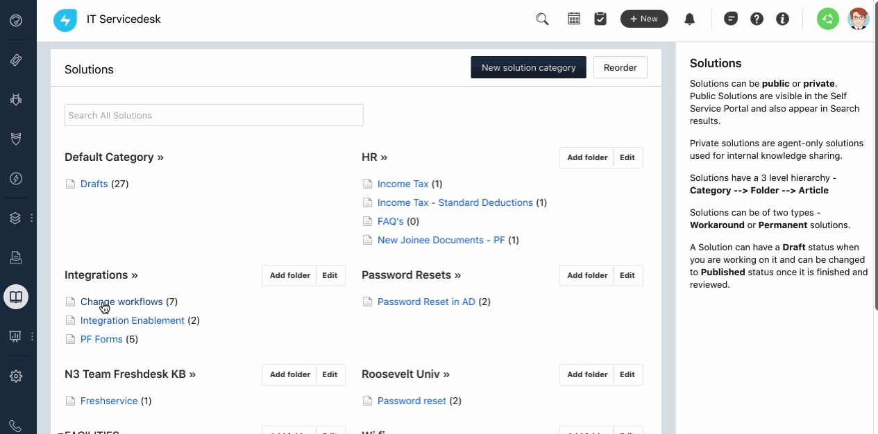 A base de conhecimento do Freshservice fornece mais flexibilidade e clareza, permitindo que você categorize sua base de conhecimento em uma hierarquia de três níveis. Isso inclui categorias de nível superior que contêm um grupo de conteúdo relacionado, pastas em cada categoria e, finalmente, artigos de solução dentro de cada pasta. Essa estrutura é mantida em sua base de conhecimento e pode ser vista na guia Soluções.