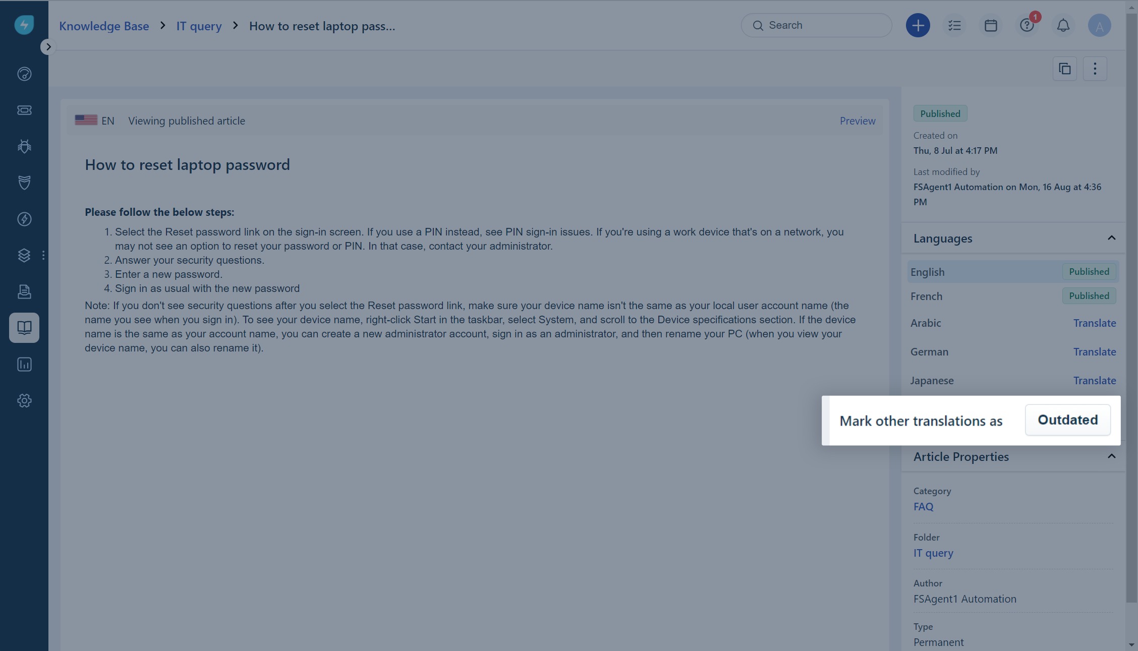 - Isso notificará os agentes que gerenciam os artigos em outros idiomas e eles poderão consultar o artigo no idioma principal para fazer as alterações. Depois de fazer as alterações necessárias, eles podem simplesmente clicar em Marcar tradução de <idioma secundário> como atualizada