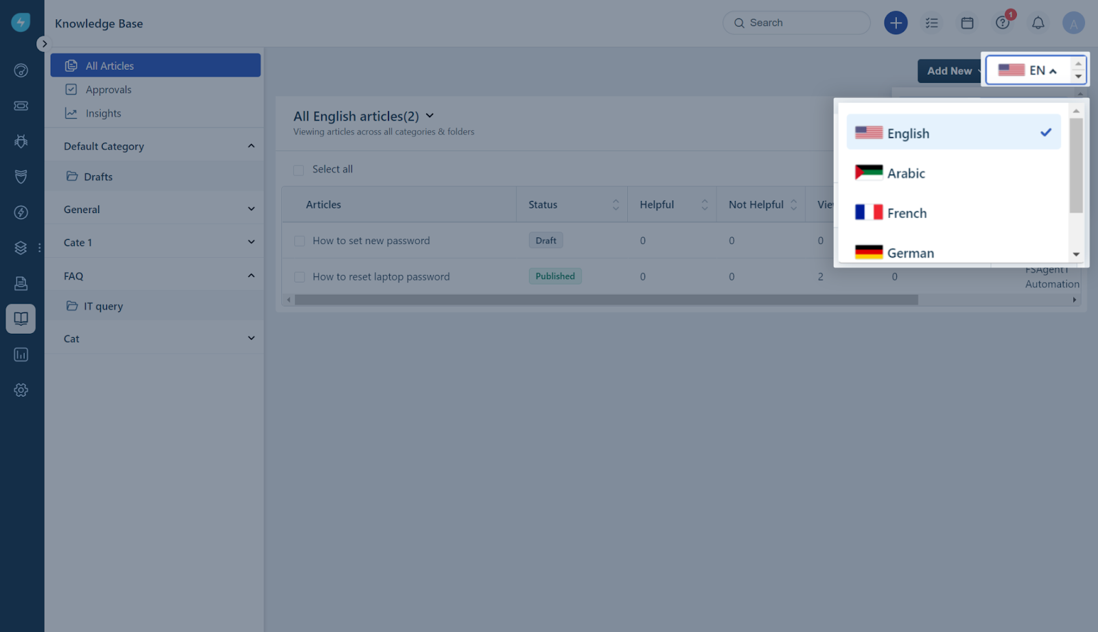 A base de conhecimento é um componente essencial para dimensionar o suporte ao cliente e, ao mesmo tempo, fornecer um serviço excelente. Agora organize uma coleção de artigos em vários idiomas para compartilhar com seus diversos clientes com o novo gerenciamento de base de conhecimento multilíngue fácil de usar . Para definir a visibilidade do usuário final, os clientes que criaram cópias multilíngues de artigos em diferentes pastas não precisam mais fazer várias cópias de um artigo principal em várias pastas.