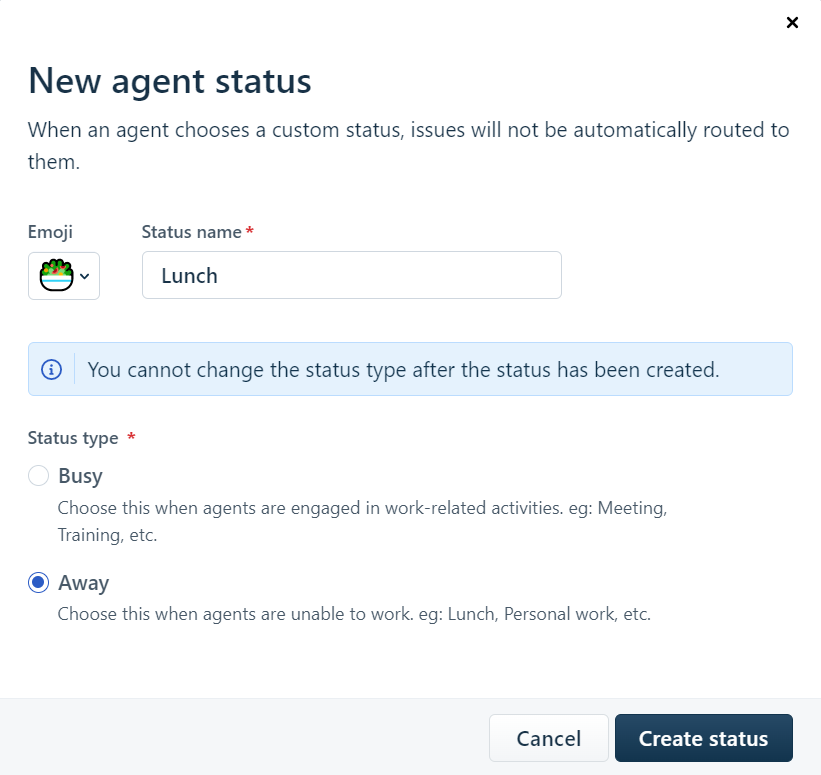 Ao criar um status de agente personalizado, você pode marcá-lo como 'Ausente' ou 'Ocupado' para indicar se o agente está disponível para resolver os problemas do cliente. Por exemplo, ao criar um status personalizado 'Intervalo', você pode marcá-lo como Ocupado para indicar que o agente está conectado, mas não está ativamente disponível para atender os clientes.