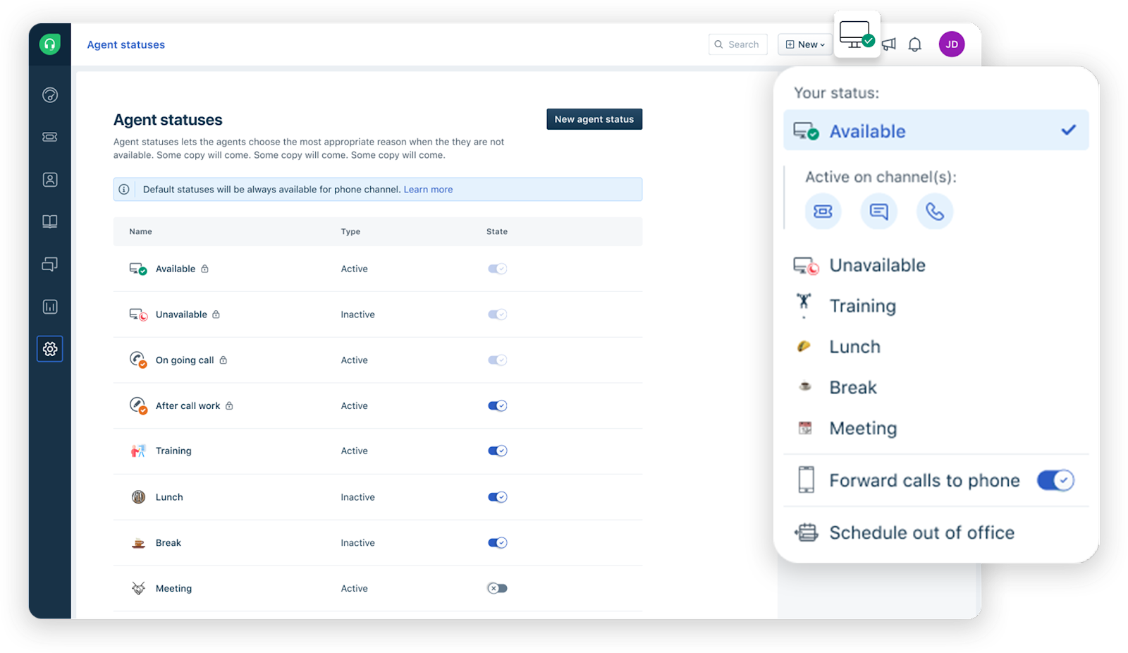 Além dos status de agente padrão disponíveis, você poderá adicionar status personalizados e ativá-los para os agentes em sua conta.