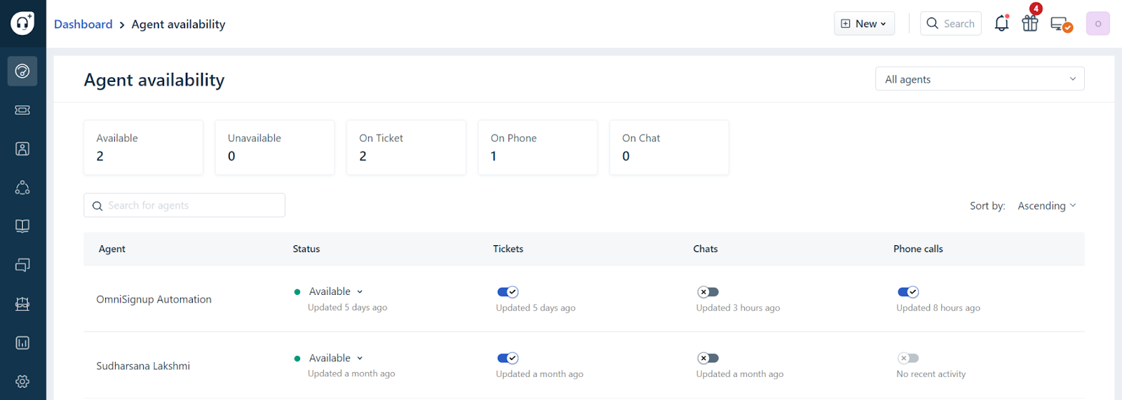 Às vezes, você pode precisar de mais agentes disponíveis para lidar com um fluxo de problemas ou para atender a quaisquer necessidades urgentes. Nesse cenário, você pode alterar o status de disponibilidade de um agente para atender às suas necessidades. Você pode fazer isso por: