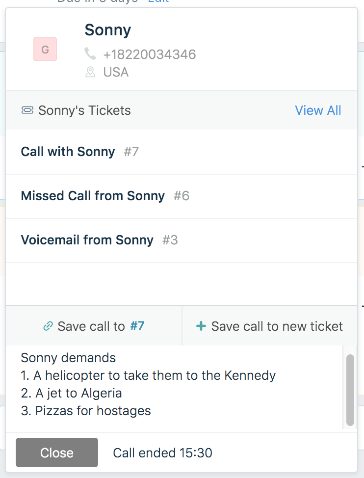 Todas as chamadas de e para o canal telefônico podem ser convertidas em tickets. Todas as suas chamadas de suporte serão contabilizadas. Quando você receber uma ligação sobre o mesmo problema pela segunda vez, os tíquetes antigos fornecerão contexto e economizarão tempo.