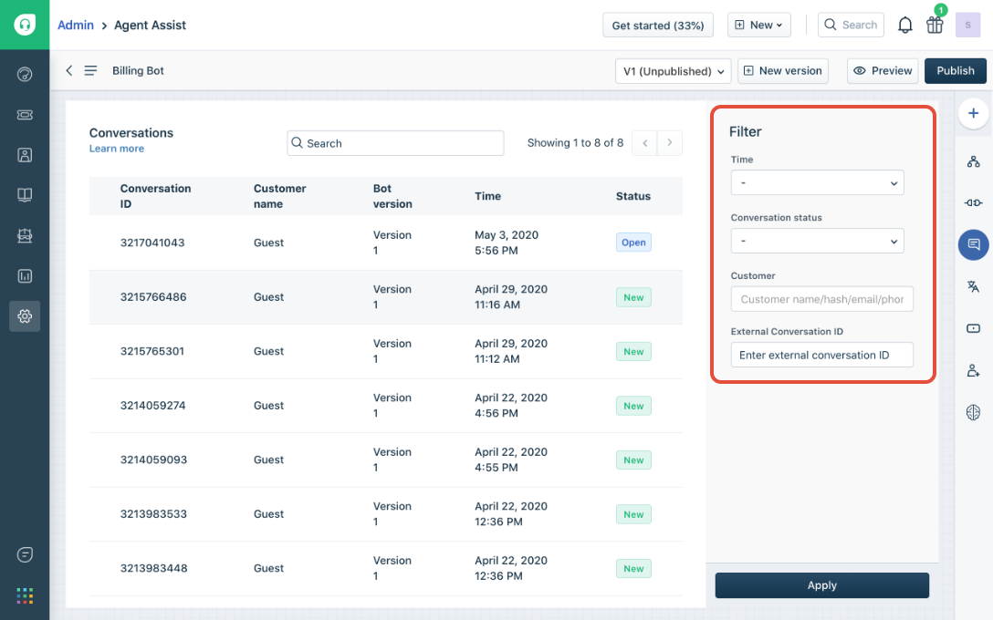 Cada conversa que seu bot tem com seus agentes é registrada como um tíquete no criador do Assist bot. Você poderá visualizar todas as mensagens trocadas entre o bot e o agente nesta página, em tempo real. Aplique os filtros necessários para aprofundar as conversas para obter detalhes do agente e também visualizar logs de atividades e chamadas de API feitas pelo bot para essa conversa.