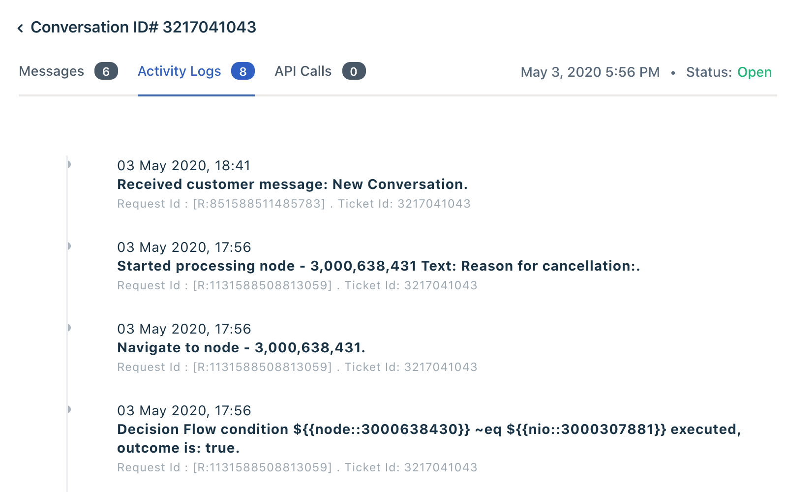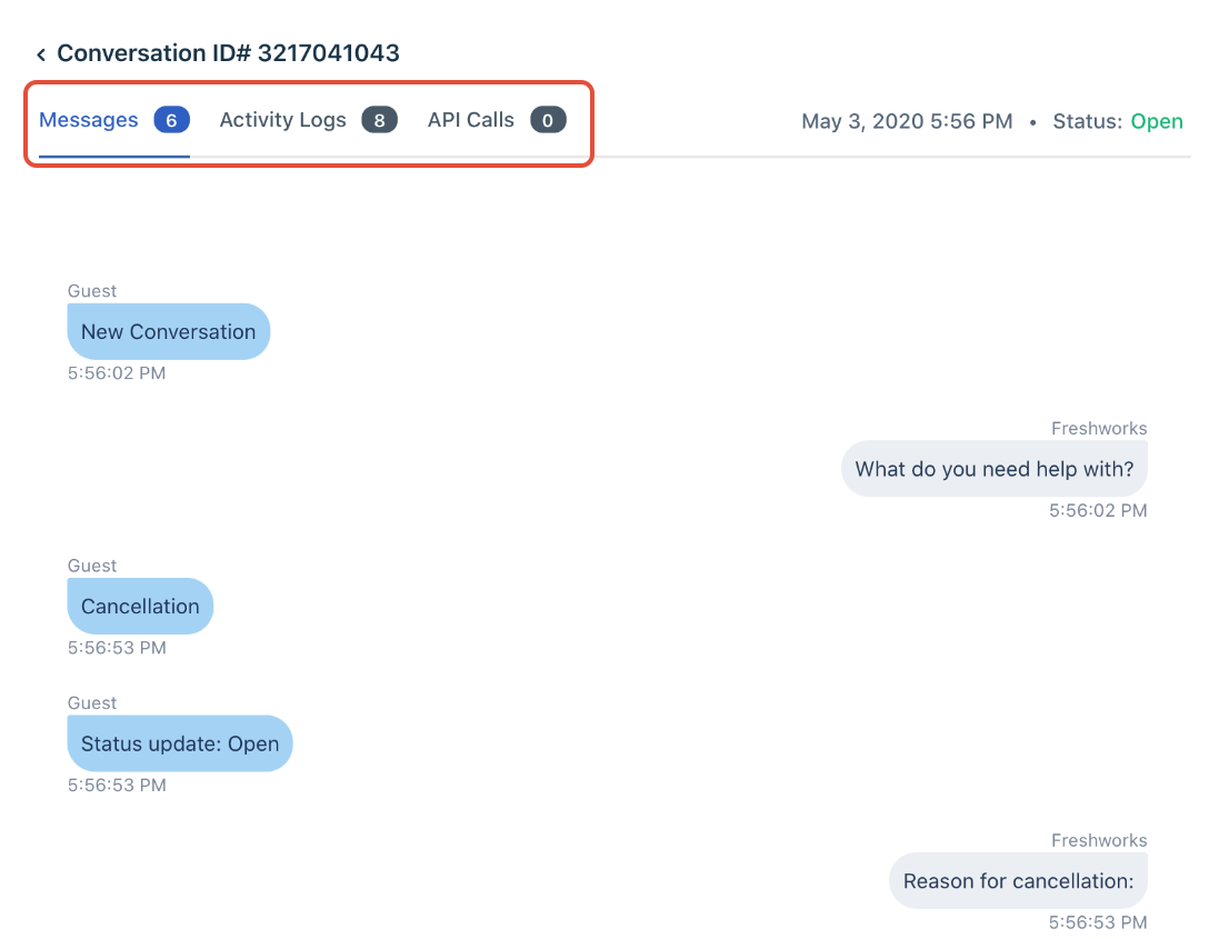 Clique em qualquer cartão de conversa da lista para visualizar a conversa real entre o bot e o agente. Nesta página, você poderá visualizar as mensagens, logs de atividades e chamadas de API como três guias separadas.
