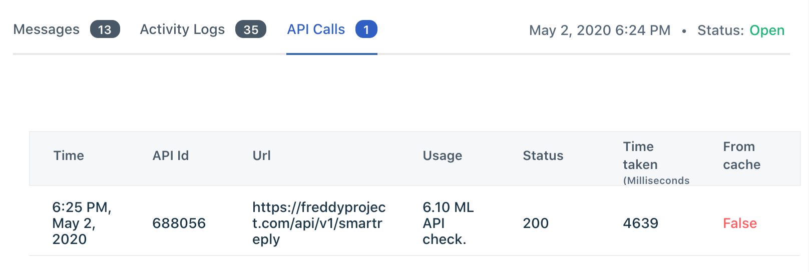 Chamadas de API: a página de chamadas de API mostrará todas as chamadas de API acionadas para essa conversa. Essas chamadas de API são baseadas em suas configurações na biblioteca de API.
