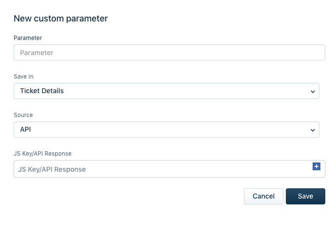 O campo Origem corresponde ao local de onde o valor do parâmetro é extraído, que pode ser JS ou API.